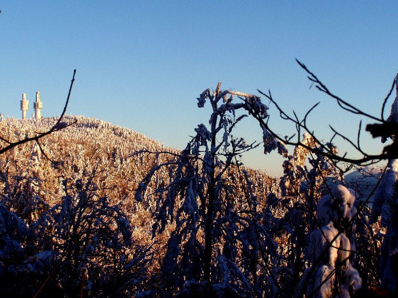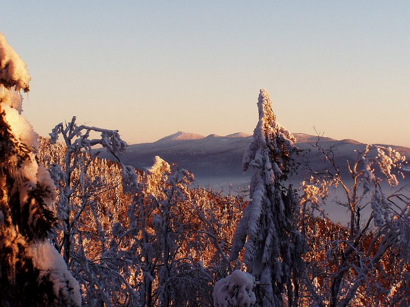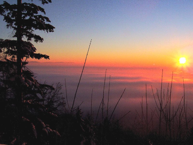 Nach der Arbeit war ich heut kurz vor Sonnenuntergang auf unserem Haustausender, dem Hohenbogen. Die Nebelwalze ist heut Mangels Wind verschwunden. Es gab dichten Nebel mit Rauhreif bis 750 m, drüber strahlenden Sonnenschein.