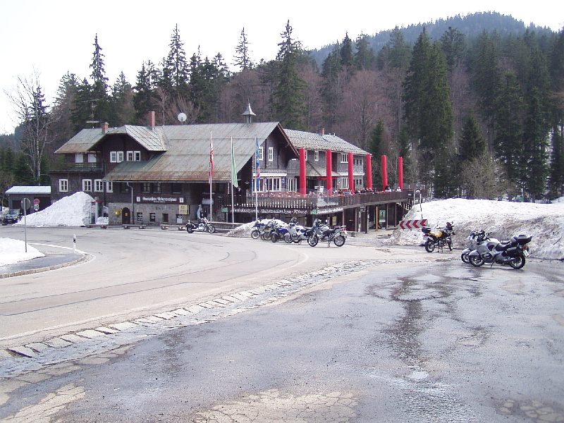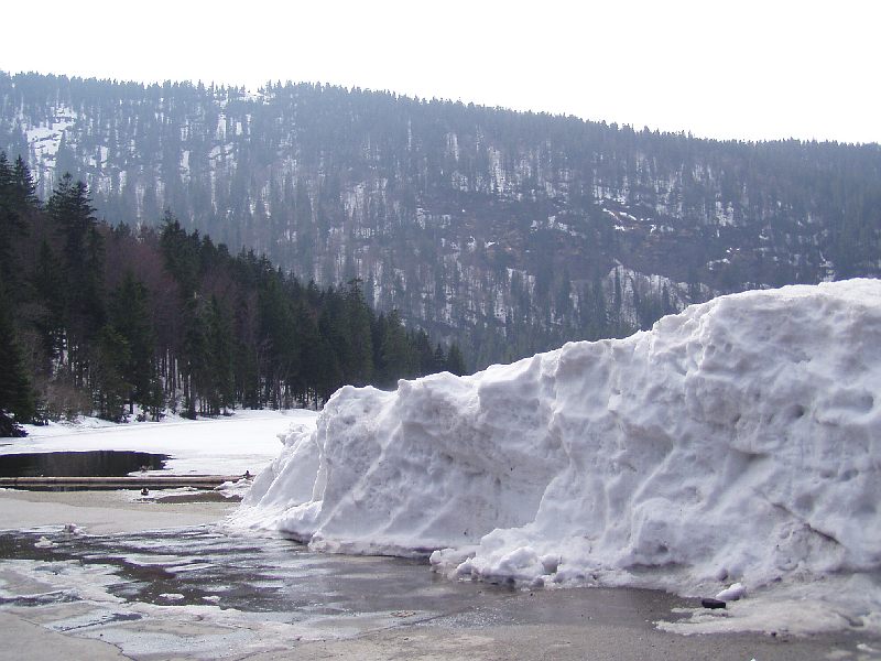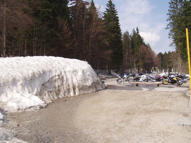 Der Arbersee ist ein beliebtes Ziel für Motorradtouren, hier neben dem schon mal höher gewesenen Schneehaufen