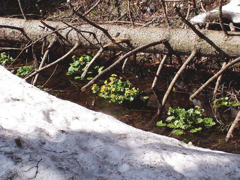Trotz des Schnees blühts stellenweise, Dotterblumen