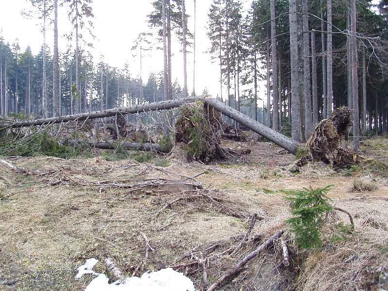 Neben dem Weg waren diese vom böhmischen geknickten Bäume, einer auf die Wurzel des anderen gefallen