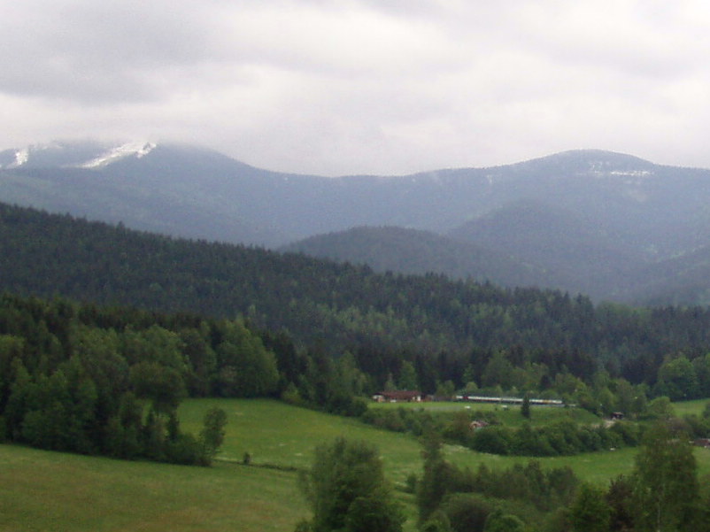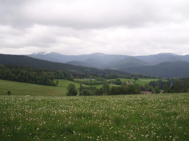 Blick von Lohberg über Pusteblumen Richtung Gr. und Kl. Arber