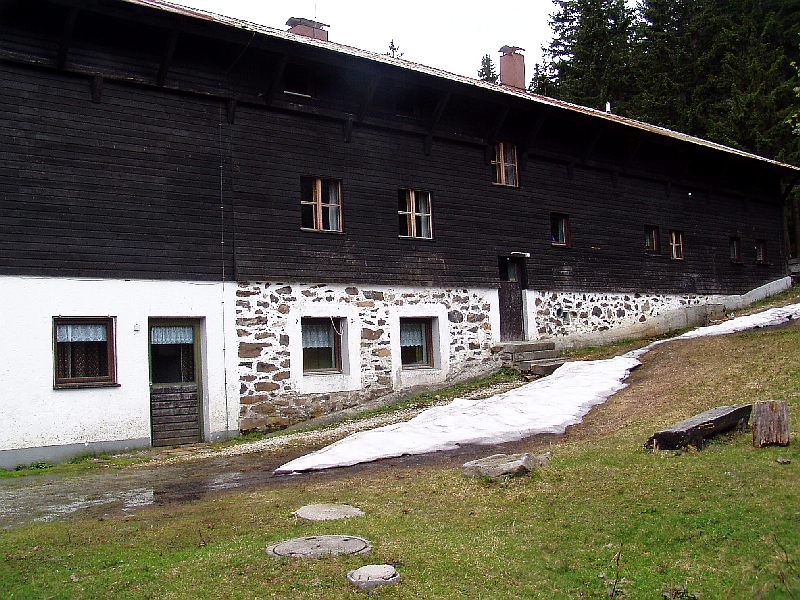 Die Chamer Hütte (1250 m) mit Dachschnee am Boden