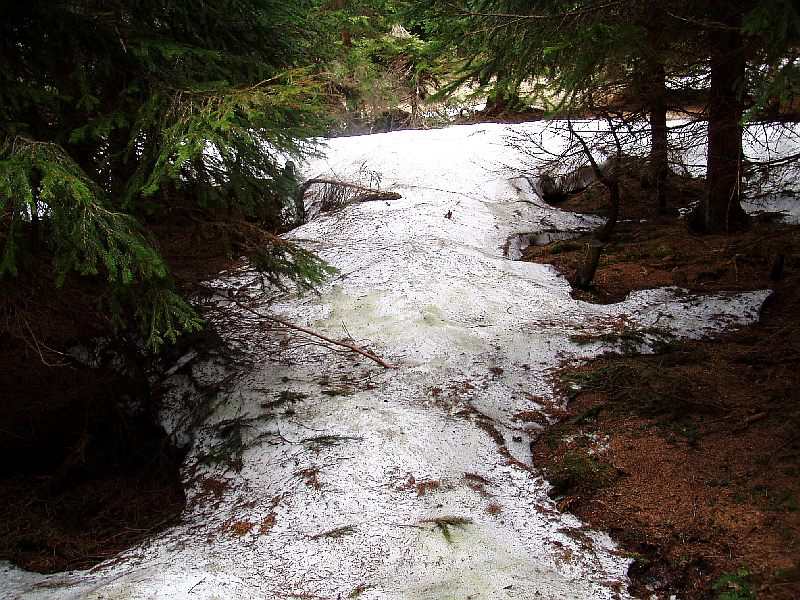 Zwischen Chamer Hütte und dem oberen Ende der Rießlochfälle war auf 1150-1250 m noch ein Gebiet mit besonders großen Schneeresten.