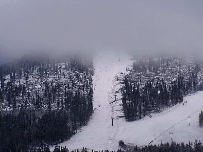 Heut vormittag sank die Schneefallgrenze im Arbergebiet bis nahe 600 m Dabei war ein NW-SO-Gefälle feststellbar, hervorgerufen vermutlich durch Stau. Am Hohenbogen war selbst am Gipfel kaum Neuschnee, bei Lohberg schon kurz nach Waldbeginn auf 650 m.