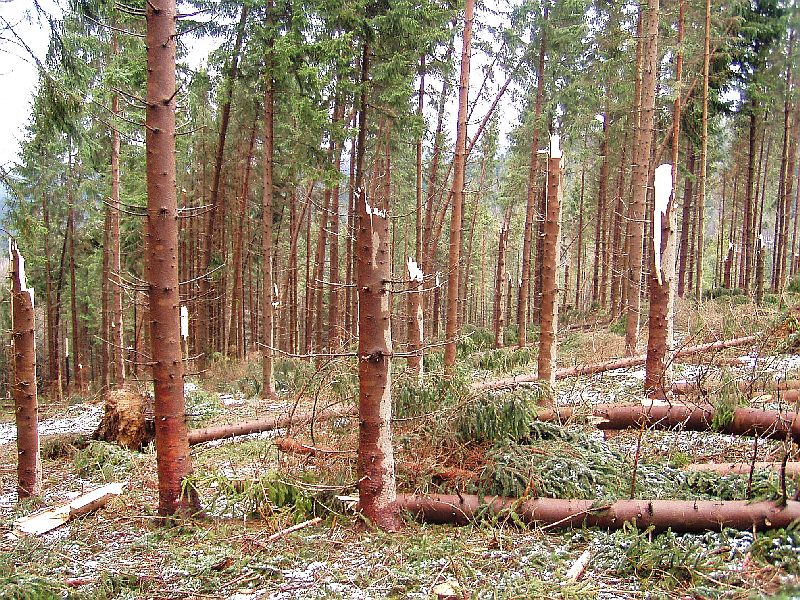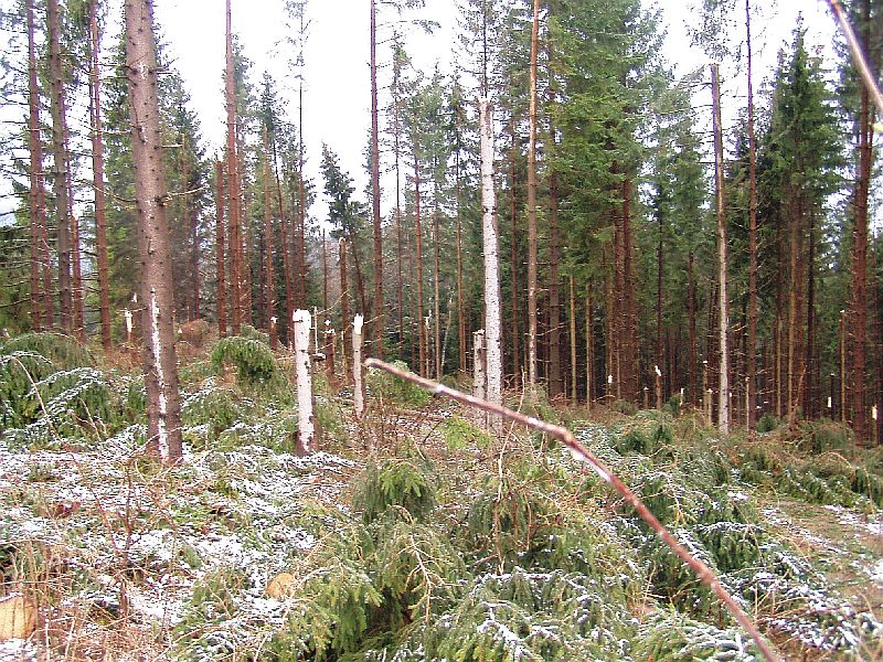 Hier wurden auf einere Fläche ca 1 km lang und 300 m breit viele Bäume auf ca 3 m Höhe geköpft.