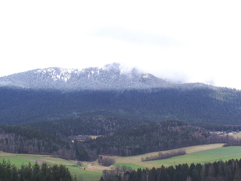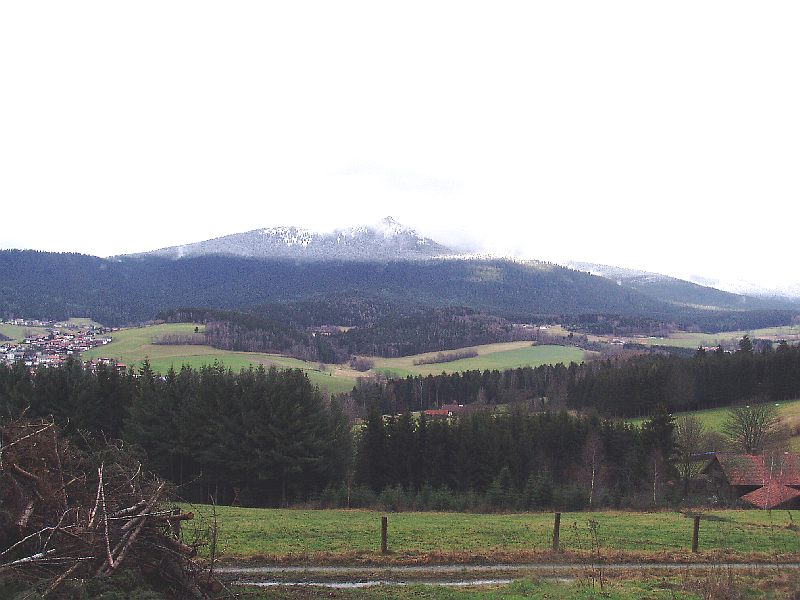 Dann zu dan Sturmschäden. Hier eine Ansicht vom Arber. Im Hang etwa Mitte scheint sich eine Schneise durch den Wald zu ziehen