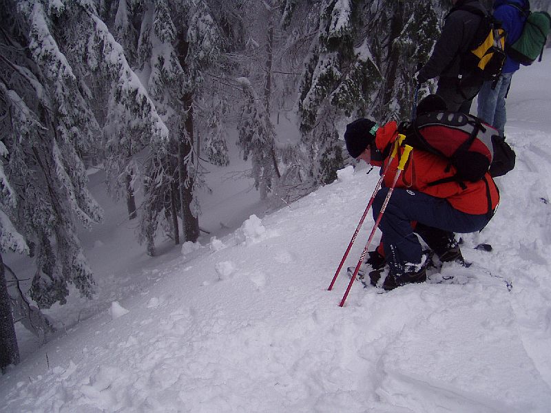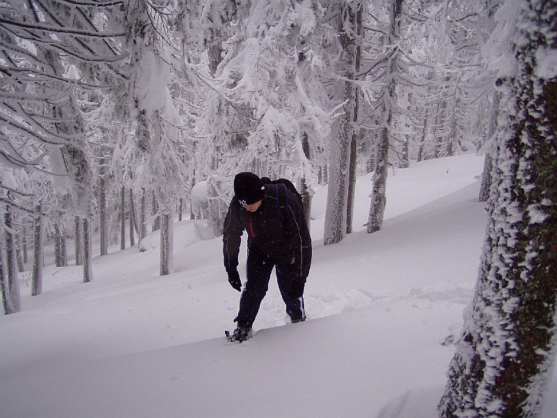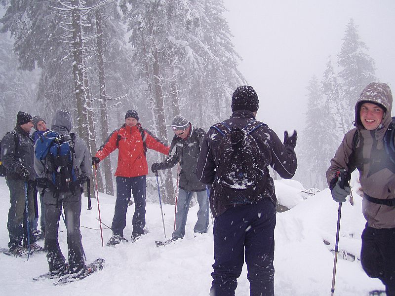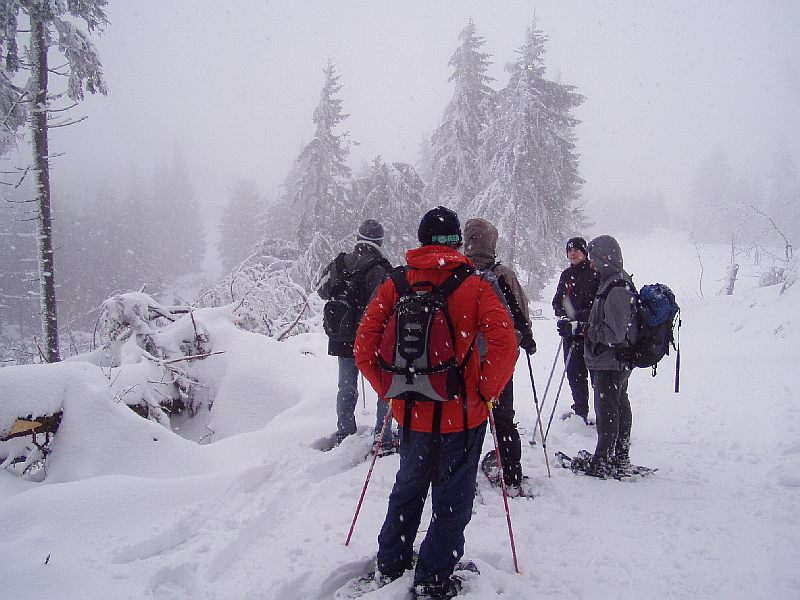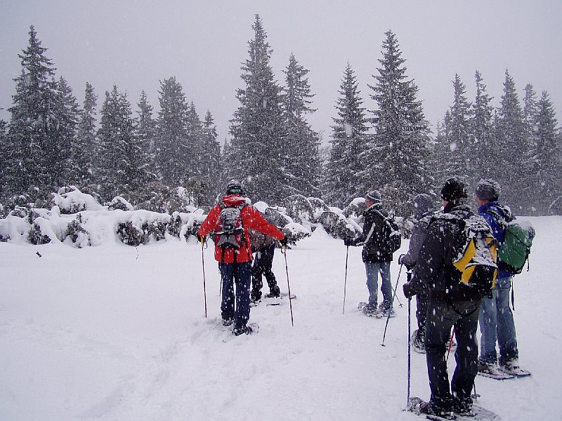 Wir gingen mit Schneeschuhen durch Waldwege im teils starken Schneefall dann talwärts.