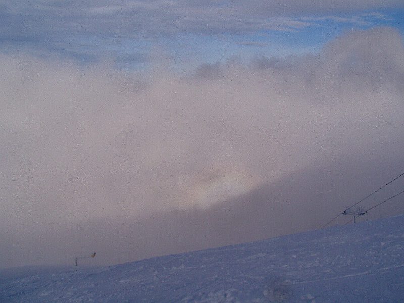 Dann noch 50 m höher wechselten schnell dichter Nebel mit klarer Sicht. Es ging ein unangenehmer Ostwind, der den Nebel mal her-und mal wegtrieb.