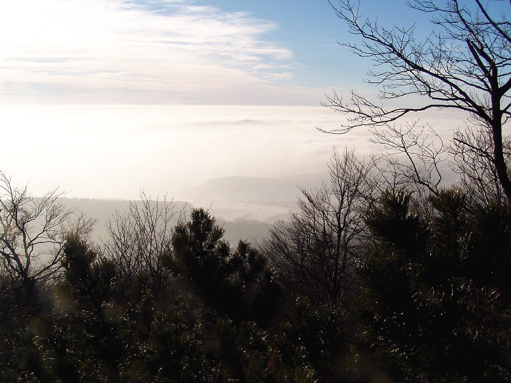 Nach Westen zu sieht man nicht viel. Die zu erahnende Bergkuppe im Dunst ist der Haidstein (750 m)