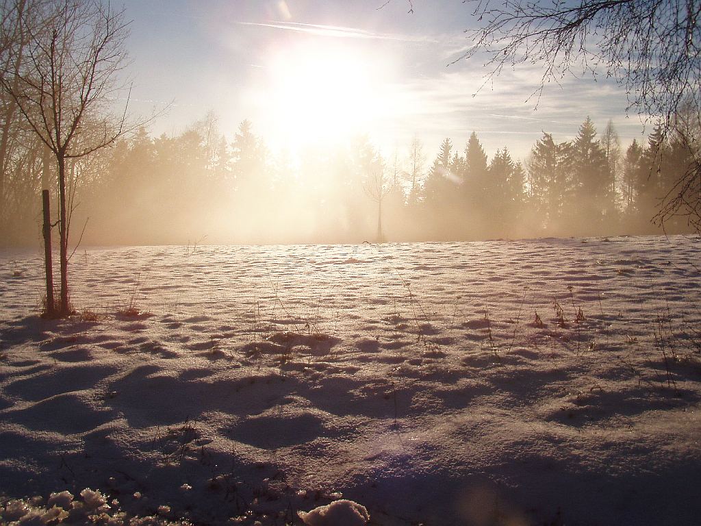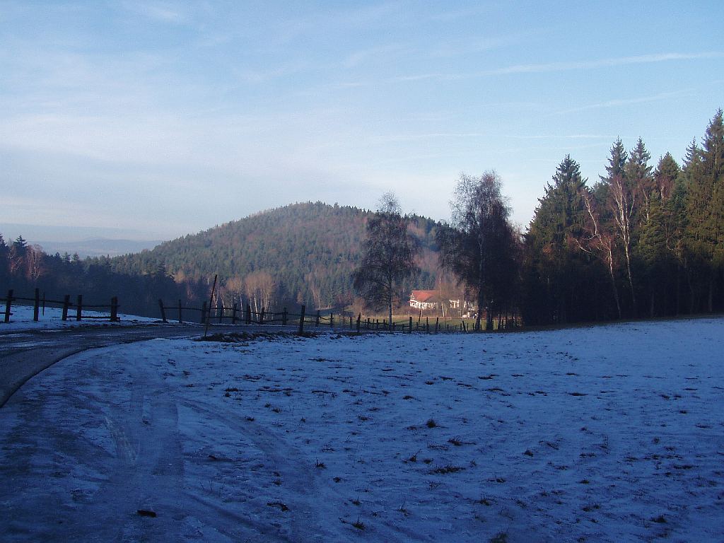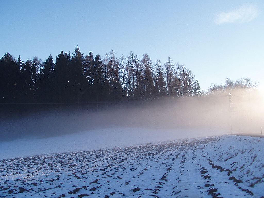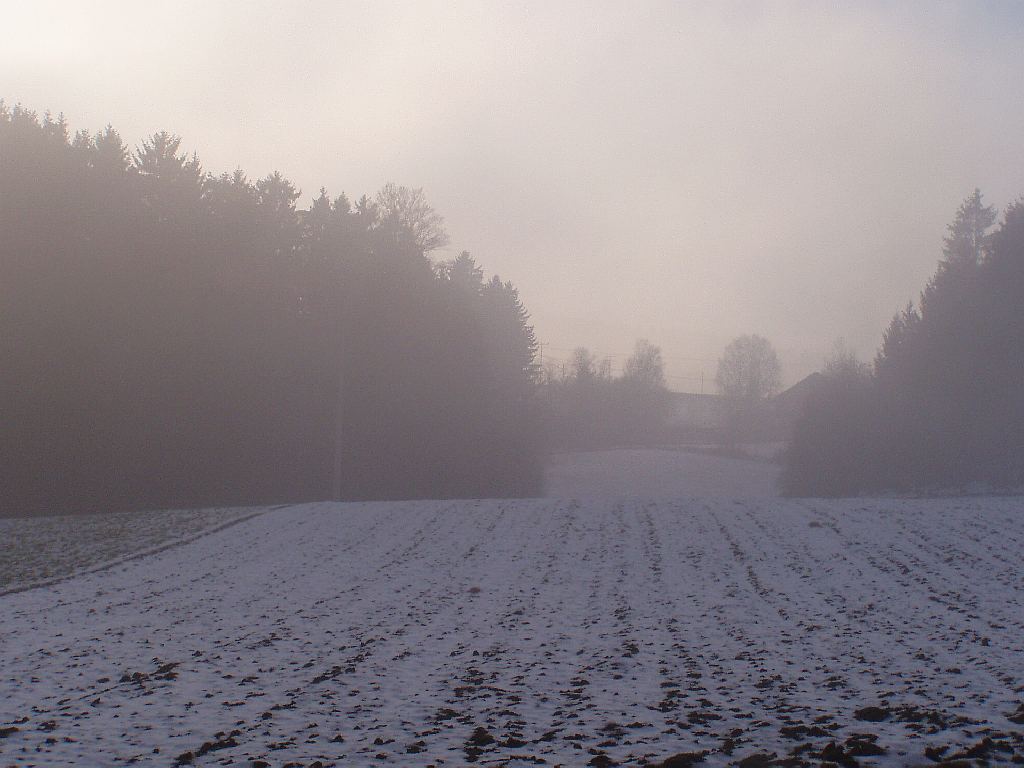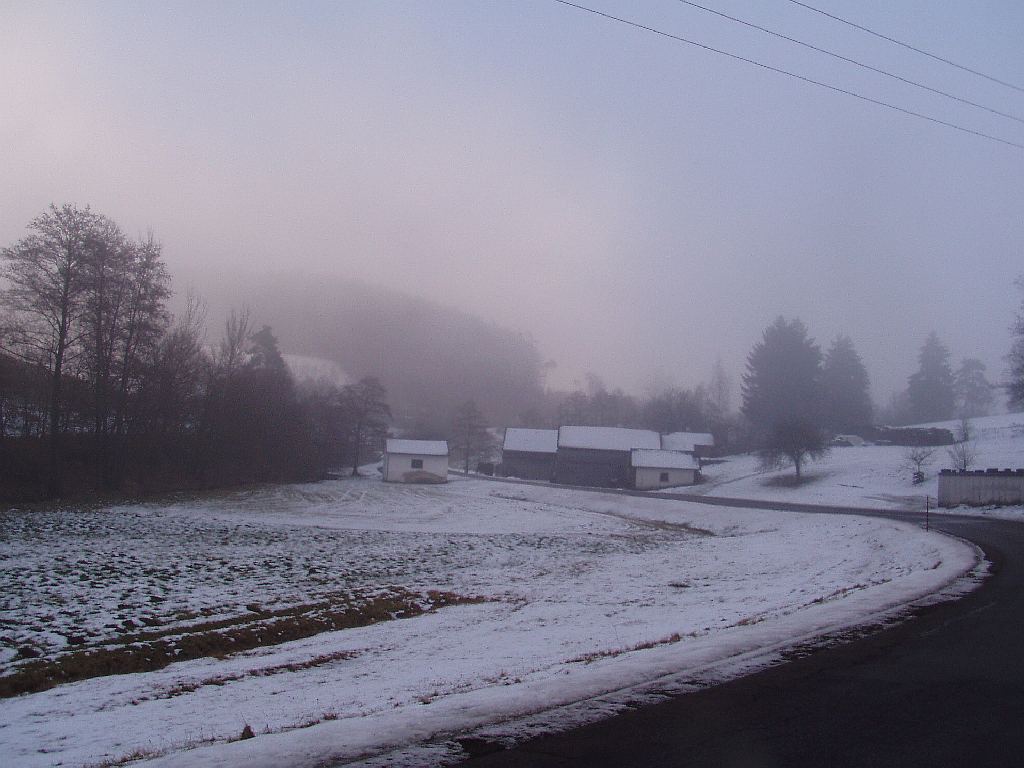.Bei Schorndorf-Knöbling (DWD-Wetterstation) war es schon merklich kühler mit 2,8°, es schien aber noch die Sonne. 5 km weiter, etwa 10 km südlich von Cham, kam ich dann in ein eiskaltes, nebeliges Gebiet, in das vom Donautal her Nebel reinzog.