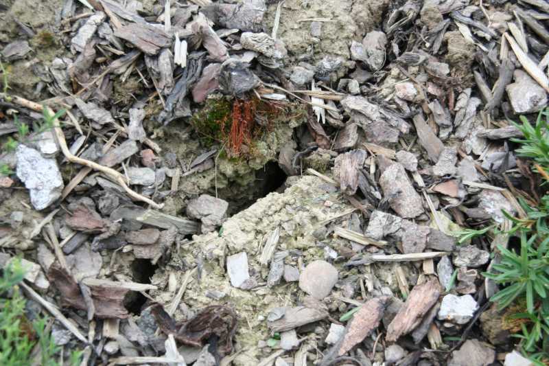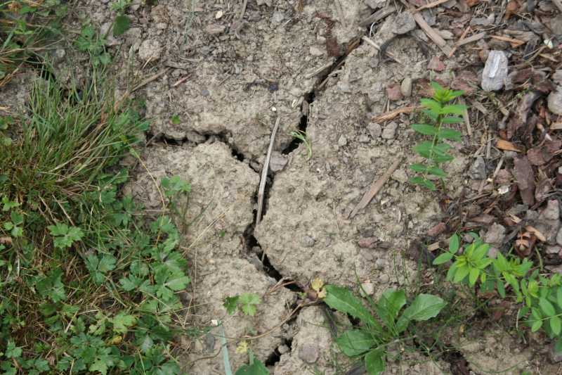 Der Rindenmulch, der den Boden darunter sehr lange feucht hält ist jetzt auch am "Ende seines Lateins" angelangt. Der Rindenmulch beginnt in die Spalten zu fallen...
