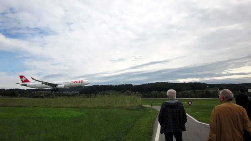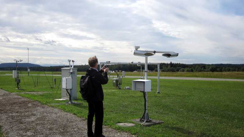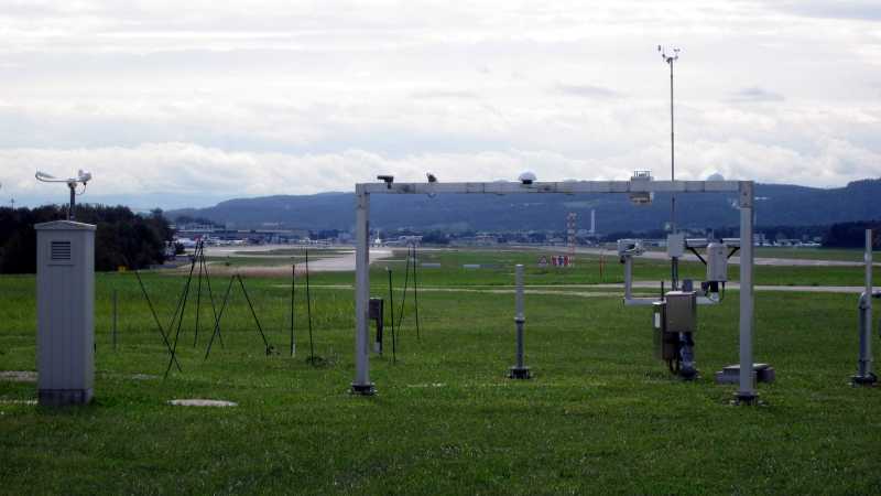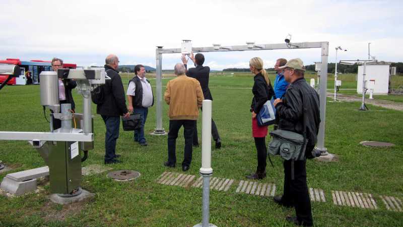 von MeteoSchweiz wurde ich am 15. September zum Abschluss des 10-jährigen Ausbaus des Bodenmessnetzes zum neuen MeteoSchweiz Standort im Flughafen Zürich eingeladen. Besonderer Höhepunkt war die Besichtigung des Messfeldes mitten im Flugfeld, nur ein guter Steinwurf von der Lande- und Startbahn entfernt. Dieser Punkt ist aus Sicherheitsgründen für die Öffentlichkeit absolut nicht zugänglich. Es ist schon sehr interessant, wenn in unmittelbarer Nähe Flugzeuge landen und starten. Für 8 geladene Gäste standen 5 MeteoSchweiz-Fachleute Rede und Antwort. Gemessen wird Niederschlagstätigkeit, Niederschlagsmenge, Luftdruck, Temperatur 2 m, Bodentemperatur, Sonnenscheindauer, Globalstrahlung, Wind, Windrichtung, Radioaktivität. Von jedem Sensor sind 2 Modelle von unterschiedlichen Herstellern vorhanden, so gibt es bei einer Störung kein Aufzeichnungsloch und die Werte können abgeglichen werden.