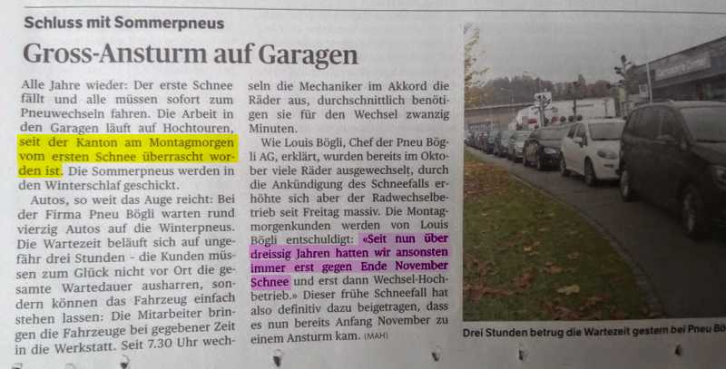 Und dann setzt der Herr Professor Doktor Bögli - seines Zeichens Garagier - noch einen obendrauf. Offenbar forscht er nebenberuflich im Bereich Klima und hat herausgefunden, dass es seit 30 Jahren NIE so früh Schnee gab!