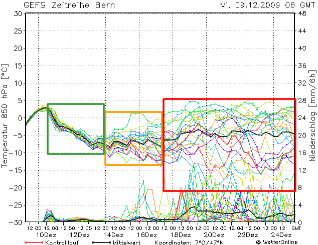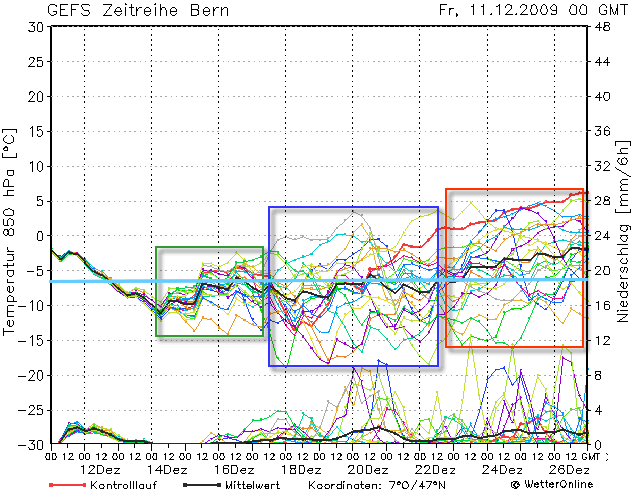 Phase "grün" ginge ja noch: Leichte Erwärmung auf tiefem Niveau. Aber wenn man den Kontrolllauf anguckt, dann steigt die 850er Temp um 5 Grad an, was eigentlich - normalerweise - auch mit schönem Aufgleischneefall einhergehn dürfte....aber eben, sautrocken.