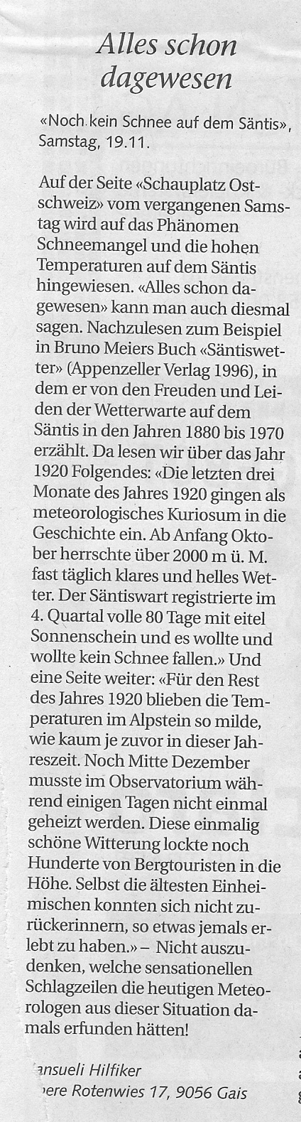 Nun hört und liest man es wieder allenthalben. Das ist noch "nie" dagewesen! Sei es die Trockenheit, oder der Schneemangel, die Wärme, ja selbst der Gletscherrückgang ist noch"nie" dagewesen.