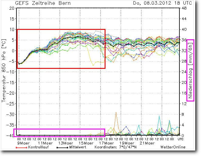 Die Karten zeigen bis am 17. März ansteigende Temperaturen und vor allem KEINEN Niederschlag. Aber vorsicht: Auf der Grafik sind die Temperaturen auf rund 1500müM angegeben. In den Niederungen wird es also etliches wärmer, insbesondere auch mit der starken Märzensonne.