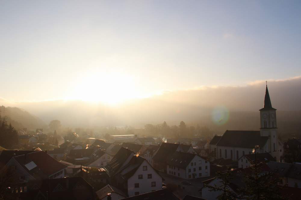 In Schwörstadt am frühen Morgen Sonnenschein, Richtung Bad Säckingen eine dchte "Nebelsuppe"