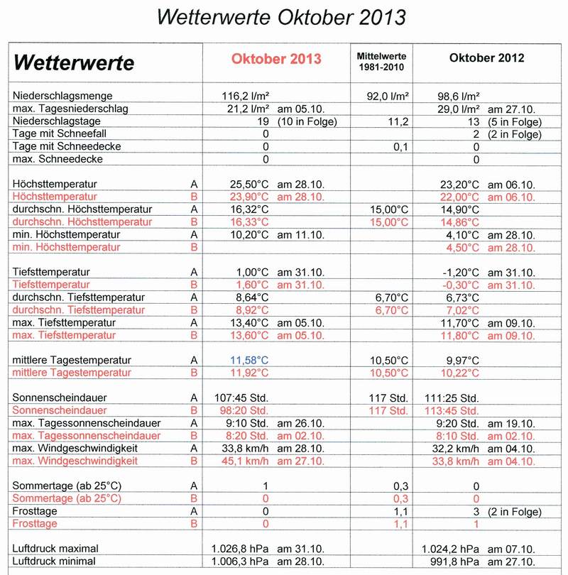 Der Oktober 2013 zeigte sich nur an einzelnen Tagen „Golden“. Er war im Mittel der Stationen A und B 1,2°C zu warm, aber gleichzeitig mit 116,2 l/m² 26% zu nass und mit einem Sonnenscheindefizit von 8% auch etwas zu grau.