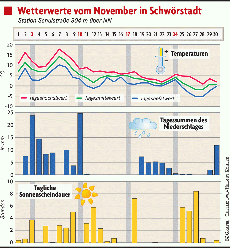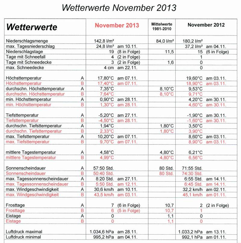 Nach einem neblig trüben ersten Novembertag gaben sich an den 3 Folgetagen im 24-stündigen Rhythmus die Sturmtiefs „Erol“, „Friedrich“ und „Godehard“ quasi die Klinke in die Hand und versorgten uns mit Wind und Regen.Durch diese Westwetterlage bekamen wir bis zum 04. November schon 54 % des normalen gesamten Novemberniederschlages. Auch an den folgenden Tagen blieb uns diese stabile, typische Wetterlage mit Wind, zahlreichen Schauern, länger andauernden Niederschlägen und nur kurzen trockenen Perioden erhalten. Am Morgen des 10. November wurde bereits der normale Novemberniederschlag von 84 l/m² überschritten und bedingt durch die weiter anhaltende Westwetterlage mit jetzt deutlich frischeren Temperaturen mussten wir nach 2012 auch dieses Jahr auf den „Martinisommer“ verzichten. Vom 13. an bestimmten die Hochs „Susanne“ und „Raily“ das Wetter und der Wind drehte auf Nord-Ost. Aber wie so oft bei herbstlichen und winterlichen Hochdrucklagen lagen wir jetzt unter einer zähen Hochnebeldecke und durch die lebhafte Bise fühlten sich die Temperaturen um 6°C an wie leicht unter dem Gefrierpunkt. Die erste Novemberhälfte war somit bis zum 17. 2,4°C zu warm, aber mit 102,4 l/m² fielen schon 22% mehr Niederschlag als in einem normalen November und mit 30:10 Stunden zeigte sich die Sonne erst 37% der langjährigen November-Sonnenscheindauer. Dank dem nebelauflösenden „Möhlin-Jet“ konnten wir am 18. nochmals einen herrlichen Herbsttag mit 7:10 Stunden Sonnenschein genießen, bevor am späten Nachmittag durch die aufziehende Bewölkung ein Wetterwechsel ankündigt wurde. Tief „Quentin“ bescherte uns die folgenden Tage typisches unbeständiges und nass-kaltes Novemberwetter. Am Abend des 21. November bekamen wir den ersten Schneefall in diesem Herbst bis zum Morgen des Folgetages stieg die Schneedecke immerhin auf 4 cm an. Im weiteren Verlauf des 24. November drehte der Wind im Einflussbereich von Hoch „Traude“ auf Nordost. Nach 9 sonnenlosen, trüben Tagen (Ausnahme der 18.) wurden unsere Gemüter durch recht viel Sonnenschein wieder aufgeheitert. Trotz des lang vermissten Sonnenscheins stiegen die Tagestemperaturen nach Nachtfrösten jedoch nur noch auf 1-5°C an. Am 27. erfreuten wir uns mit 8:20 Stunden am längsten Tagessonnenschein des Monats und am Folgetag verzeichneten wir mit -5,2°C die tiefste Temperatur, mit 0,9°C die kälteste Tageshöchsttemperatur und mit 1.034,6 hPa den höchsten Luftdruck des Monats. Tief „Uwe“ sorgte dann die letzten 2 Novembertage für viel Bewölkung und den letzten Schneefall in diesem Herbst.