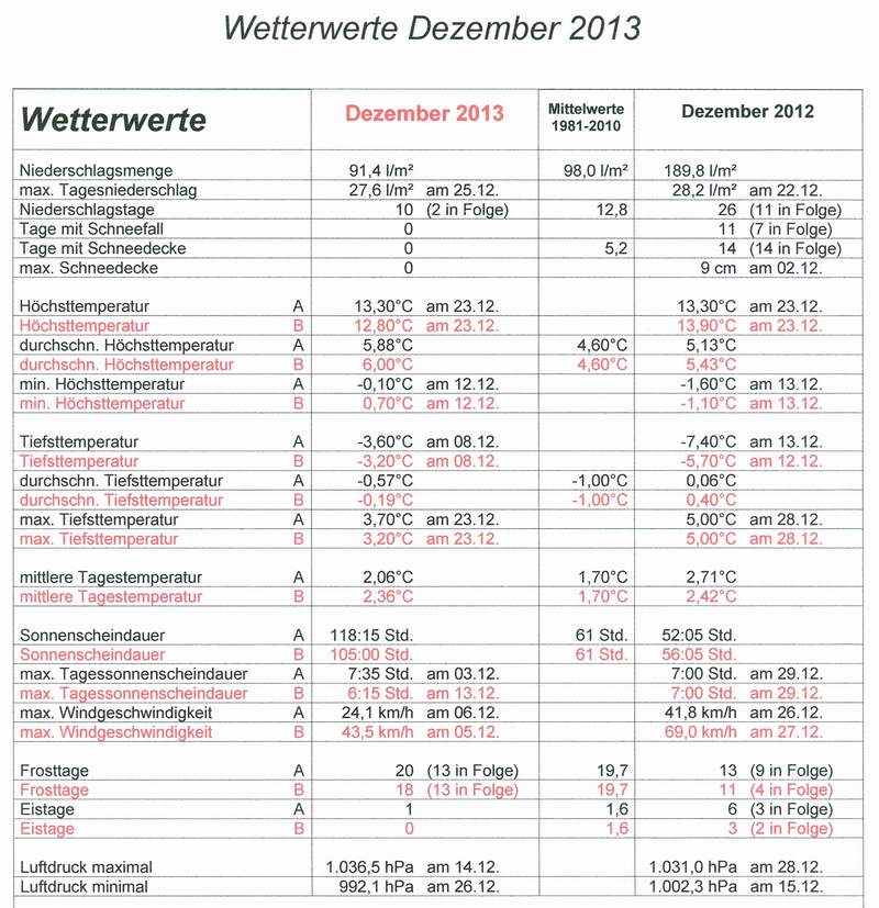 Zeigte sich der Winter im Dezember 2012 noch mit 11 Schneefalltagen und an 14 Tagen mit einer Schneedecke, so warteten wir im diesjährigen ersten Wintermonat den ganzen Monat über vergebens auf Schneeflocken. Als Ausgleich zur fehlenden „weißen Pracht“ wurden wir jedoch mit 118 Sonnenstunden, dem absoluten Dezemberrekord und fast der doppelten normalen Dezember-Sonnenscheindauer verwöhnt. War die erste Monatshälfte noch 0,8°C zu kalt, gab es am Monatsende mit einem durchschnittlichen Niederschlag noch einen Temperaturüberschuss von 0,2°C.
