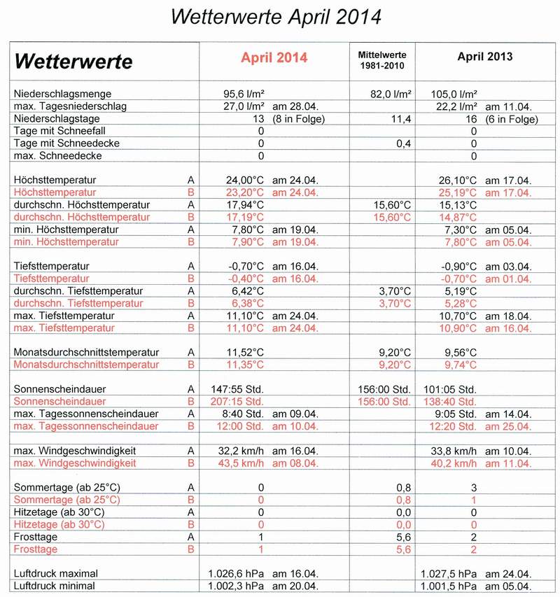 Die frühlingshafte erste Aprilhälfte war somit 3°C zu warm, mit 14 l/m² fielen erst 17% des normalen April-Niederschlages und die Sonne schien mit 121 Stunden schon 78% des April-Normwertes von 1981 bis 2010. Nach einer sternenklaren Nacht verzeichneten wir am Morgen des 16. mit –0,7°C den ersten Luftfrost in diesem Monat. April, April, er macht was er will... mit Tief „Quendolin“ strömte am Karfreitag höhenkalte Luft von Nordwesten zu uns. Hierdurch zeigte sich der April auch einmal von seiner kühlen und wechselhaft-launischen Seite. Am Karsamstag erreichte die Tages-Höchsttemperatur grade noch 7,8°C. Nach einem sehr sonnigen und bis 19°C warmen Ostersonntag, an dem die langjährige durchschnittliche April-Sonnenscheindauer schon überboten wurde, brachten die frühlingshaft milden Folgetage mit schwachen Luftdruckgegensätzen typisches „Tagesgangwetter“. Das bedeutete Sonnenschein bis zum Nachmittag und Quellwolken gegen Abend, aus denen sich kurze Schauer entwickelten. Am Sonntag 27. April griffen Ausläufer vom Tiefdruckgebiet „Sabine“ auf unsere Region über und bescherten uns für den Rest des Monats mit deutlich kühleren Temperaturen unbeständiges und sehr regenreiches Wetter.