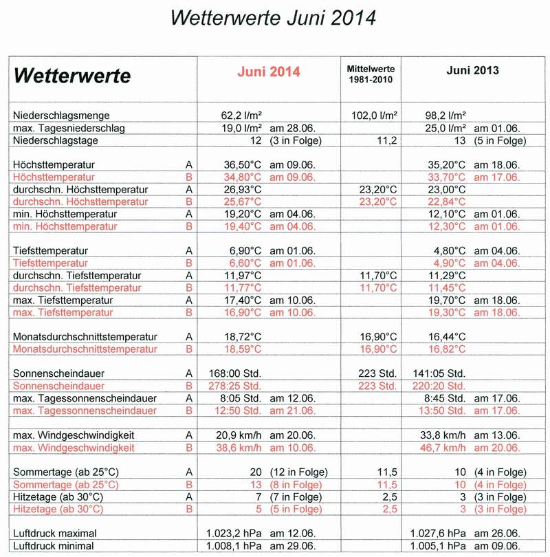 Der erste Sommermonat machte seinem Namen alle Ehre. War die erste Juniwoche noch 1°C zu kalt, hatten wir am Monatsende einen Temperaturüberschuss von 1,8°C, die Sonne schien mit 278:25 Stunden 25% länger als in einem normalen Juni und mit dem hohen Sonnenanteil war es 39,8 l/m² zu trocken.