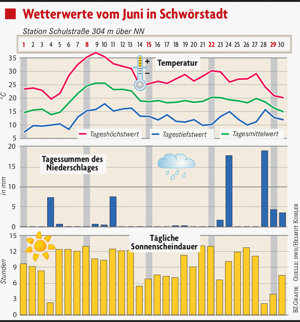 Die ersten 3 Tage des meteorologischen Sommermonats zeigten sich dank Hoch „Vinko“ trotz einiger Quellwolken recht sonnig und um 22-23°C warm. Am Nachmittag des 4. Juni kamen wir in den Einflussbereich von Tief „Dena“, das uns 7,8 l/m² Regen brachte, doch schon am Folgetag setzte sich Hoch „Wolfgang“ durch und machte den Weg frei zur ersten Hitzeperiode in diesem Jahr. Am 7. verzeichneten wir mit 32,1°C den ersten Hitzetag (ab 30°C) in diesem Jahr und am 9. mit 36,5° die bisher höchste Temperatur in diesem Jahr. Der Grund für diese 6 Hitzetage in Folge war, dass zwischen dem Atlantiktief „Ela“ und dem osteuropäischen Hoch „Wolfgang“ Luftmassen aus der nordwestlichen Sahara direkt zu uns geführt wurden. Auf ihrem Weg überquerten sie das westliche Mittelmeer, kamen über das Rhonetal und Ostfrankreich nach Mitteleuropa und versorgten unsere Region mit den höchsten Temperaturen in Europa. Im Gegensatz zu anderen Regionen mit unwetterartigen, schweren Gewittern wurden wir während dieser Hitzeperiode 2 mal nachts von Gewittern leicht gestreift, dabei fielen 8,4 l/m² Regen. Am 14. verlagerte sich Hoch „Wolfgang“ Richtung Westen, dadurch kamen die Luftmassen jetzt aus Nord-West und brachten uns nach 7 Hitzetagen in Folge bei immer noch recht sonnigem Wetter angenehm kühlere Temperaturen um 23-25°C. Nachdem die erste Juniwoche noch 1°C zu kalt war, zeigte sich die erste Junihalbzeit bedingt durch die zurückliegende Hitzeperiode 2,4°C zu warm, mit 16,2 l/m² fielen erst 16% des normalen Juniniederschlages und die Sonne schien mit 146:20 Stunden schon 66% der langjährigen gesamten Juni-Sonnenscheindauer. Dank Hoch „Xerxes“ wurden wir die folgenden 8 Tage der 2. Junihälfte mit sehr sonnigem Badewetter verwöhnt, 2 kurze nächtliche Regenschauer mit gesamt 0,4 l/m² konnten die andauernde Trockenheit und hohe Waldbrandgefahr nicht mindern. Bereits am 23. Juni wurde die langjährige normale Juni-Sonnenscheindauer übertroffen. In der Nacht vom 23. auf den 24. Juni gab es Dank Tief „Hildegunde“ mit 19 l/m² innerhalb 7 Stunden mehr Regen als in den gesamten ersten 24 Junitagen. Dieser Regen war für die Natur der reinste „Jungbrunnen“, mit 35% des normalen Juni-Niederschlages war es aber immer noch deutlich zu trocken. Nach dieser wohltuenden Dusche kamen wir tagsüber in den Einflussbereich von Hoch „Yoshiki“ und Dank dieses neuen Hochs konnten wir uns bis zum 28. Juni wieder an sehr sonnigem, trockenem und über 26 Grad warmem Wetter erfreuen. Am Samstagmittag 28. Juni erreichte uns die Kaltfront von Tief „Jutta“ was zu Gewittern und Regenschauern führte. Somit verabschiedete sich der Juni an den letzten beiden Tagen regnerisch und kühler, nach dem trockenen Monatsverlauf für die Vegetation eine reine Wohltat, für die Badefans ein Ärgernis, aber die kamen ja diesen Monat voll und ganz auf ihre Kosten.