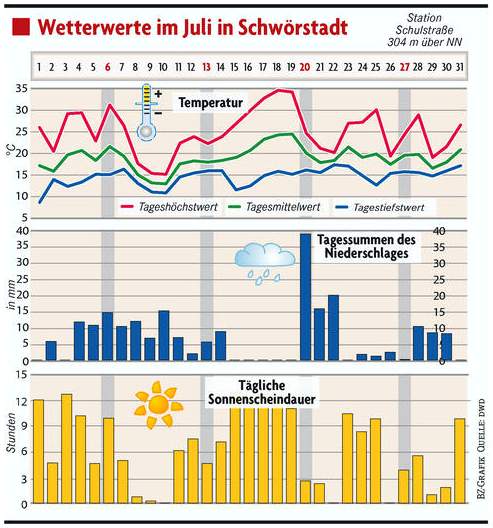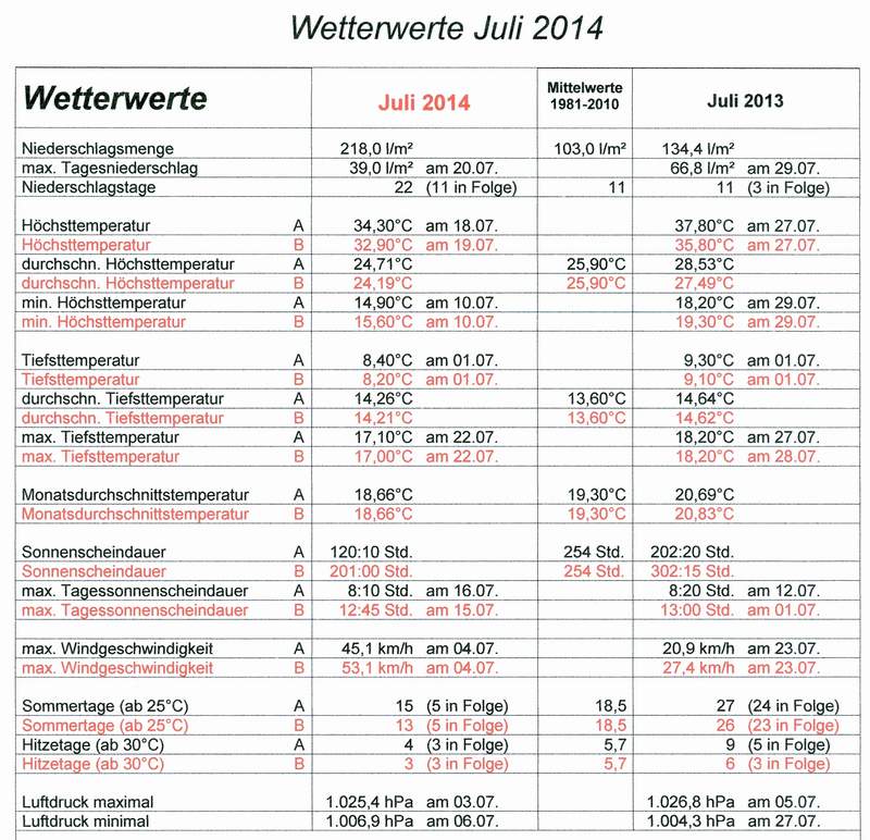 Der Juli begann mit Ausnahme von 5,8 l/m² Regen am 2. Juli dank Azorenhoch „Yoshiki“ sommerlich bis hochsommerlich warm und sonnig. „Auf die Hitze folgen Blitze“: In der Nacht vom 4. auf den 5. Juli wurden mit einer südwestlichen Strömung feucht-warme Luftmassen aus der westlichen Mittelmeerregion zu uns transportiert, was zu Gewittern und Regenschauern führte. Mit dem über Tage wetterbestimmenden Tief „Michaela“ blieb es dann bis zum 8. mit täglichen Gewittern bei dem wechselhaften und niederschlagsreichen Wetter. Durch die eingeflossene Kaltluft war die Gewittertätigkeit ab dem 8. Juli vorerst beendet, die folgenden 3 Tage stiegen jedoch die Nachmittagstemperaturen mit weiterem Regen nur noch auf herbstliche15/16°C an. Mit weiteren Regenschauern stiegen die Temperaturen ab dem 11. Juli wieder auf deutlich über 20°C an. Nach 9 Tagen Regentschaft von Tief „Michaela“, nahm am 13. Juli Tief „Nike“ das Zepter in die Hand und versorgte uns weiter mit Regen und gewittrigen Schauern. Am 13. Juli, dem WM-Finaltag wurde bereits der normale Juliniederschlag übertroffen. Nach 11 Niederschlagstagen in Folge war der 15. Juli erstmals wieder niederschlagsfrei. In der ersten Julihälfte registrierten wir mit nur 3 niederschlagsfreien Tagen bereits 7,8 l/m² mehr Niederschlag als in einem normalen gesamten Juli, gegenüber der Normwertperiode von 1991 – 2010 war es 2°C zu kalt und die Sonnenscheindauer erreicht erst 38%. In der Folge wurde mit Hoch "Aymen" von der Biskaya wieder trockenere Luft herangeführt. Die folgenden, sehr sonnigen Tage kamen wir in den Einflussbereich von südwestlicher Subtropikluft, dadurch wurde es von Tag zu Tag wärmer. Nach 3 Hitzetagen (ab 30°C) in Folge kam es am Sonntag 20. Juli durch den Einfluss von Tief „Paula“ zu heftigen Gewittern und ergiebigem Regen. Bei Tagestemperaturen um 20°C regnete es bis zum 22. mit knapp 75 l/m² ca. ¾ des durchschnittlichen gesamten Juliniederschlages. Mit Hoch „Bertram“ bekamen wir ab dem 23. wieder überwiegend freundliches Wetter mit sommerlichen Temperaturen. In den doch noch feucht-labilen Luftmassen kam es jedoch vor allem nachmittags und abends vereinzelt zu Schauer oder Gewitter. Am 26. kamen wir wieder in den Einflussbereich von Tief „Paula“. Mit „Paula“ und ab dem 29. unter der Regie von Tief „Quintia“ bekamen wir die letzten Julitage mit einem Mix aus Sonne und Wolken, sowie Schauern und Gewittern zur Freude der Pilzsammler fast tropische Verhältnisse. Auch für Anfang August ist mit sommerlichen Temperaturen kein beständiges Hoch in Sicht.