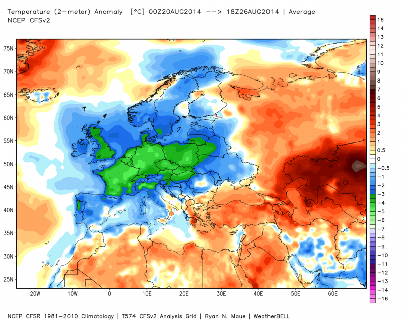 Here is a quite impressive 2m temperature analysis across Europe dueing the last 7 days - there were strongly negative anomalies almost across the whole continent, except the extreme SE corner into Turkey. Parts of W-CNTRL Europe have experienced around 6°C lower temperatures than average, which is surely not so welcomed in summer month.