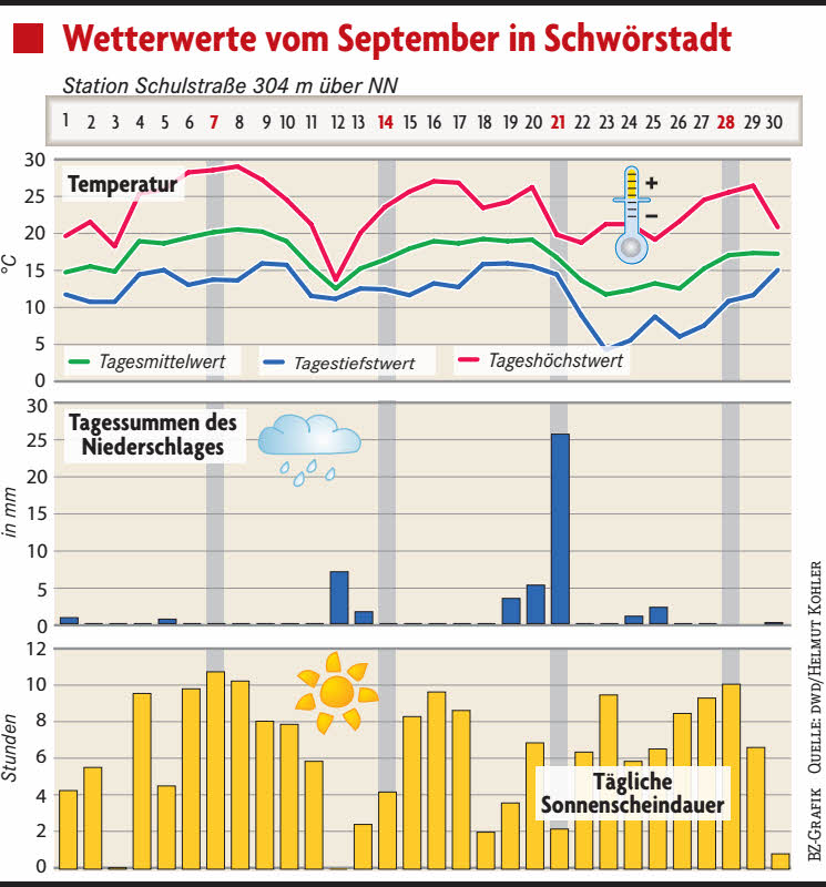 Am 1. September begann nach meteorologischer Zeitrechnung der Herbst und dem entsprechend zeigten sich die ersten 3 Septembertage schon mal herbstlich. Durch eine zähe Hochnebeldecke machte sich die Sonne rar und die Tageshöchsttemperaturen bewegten sich nur zwischen 18 und 21°C. Was der August über weite Teile vermissen lies, bescherten uns die Hochs „Görge“ und „Helmut“, nämlich mit viel Sonnenschein 6 Sommertage in Folge. Am 4. verzeichneten wir den ersten Sommertag des Monats und am 8. mit 28,7°C die höchste Temperatur in diesem September. Nach einer niederschlagsfreien Woche gab es unter dem Einfluss von Tief „Dagmar“ am 12. und in der Nacht zum 13. 8,6 l/m² Regen. Durch die eingeflossene Kaltluft und unter einer dichten Wolkendecke stieg die Tages-Höchsttemperatur am 12. gerade noch auf bescheidene 13,4°C an. Am 14. September setzte sich dann Hoch „Helmut“ erneut durch und bescherte uns wieder sonniges und warmes Spätsommerwetter. Am 15. verzeichneten wir mit 25,3°C sogar wieder einen Sommertag. Die erste Septemberhalbzeit war somit 2,5°C zu warm, mit 10 l/m² fielen erst 10,5% des normalen Septemberniederschlages und die Sonne schien mit 91 Stunden schon 56% der langjährigen September-Sonnenscheindauer. Bei immer noch spätsommerlichen Temperaturen nahm die Bewölkung am 18. durch Tief „Elisabeth“ zu und an den 2 Folgetagen kam es neben Sonnenschein auch zu Regenschauern. Nachdem wir am 20. mit 25,9°C nochmals einen Sommertag genießen konnten, wechselte die Wetterlage nach einem Gewitter am frühen Sonntagmorgen 21. September von Spätsommer auf Herbst. Am 21. fiel mit 25,6 l/m² 7 l/m² mehr Regen als an den ersten 20 Septembertagen zusammen. Im Einflussbereich von Hoch „Josef“ konnten wir uns bis zum 24. nach meist klaren und kalten Nächten an recht sonnigem und ruhigen Herbstwetter erfreuen. Am 23. registrierten wir mit 3,9°C, die tiefste Temperatur seit dem 16. Mai. Nach 3 l/m² Regen am 24./25. setzte sich bis zum Monatsende Dank Hoch „Kieron“ der ersehnte „Altweibersommer“ mit viel Sonnenschein und Temperaturen von deutlich über 20 Grad durch. Mit 25,2°C am 28. und 26,1°C am 29. konnten wir sogar nochmals Sommertage genießen, bevor am letzten Septembertag die Bewölkung zunahm, die Sonne nur 50 Minuten zum Vorschein kam und 0,2 l/m² Regen fiel.
