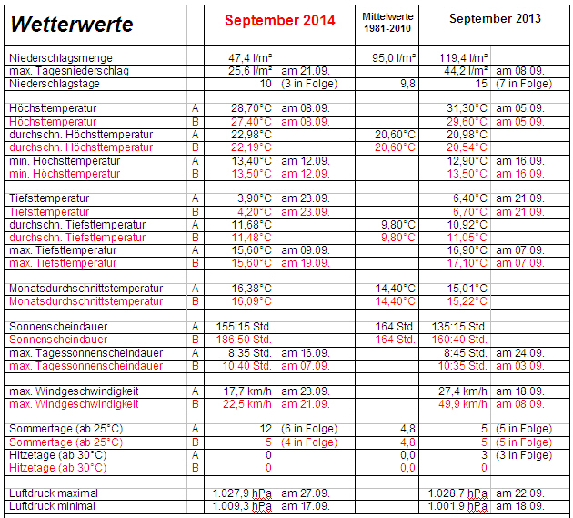 Als kleine Wiedergutmachung zum eher herbstlichen August war der erste Herbstmonat gegenüber der Norm von 1981-2010 mit 12 Sommertagen, 2 mehr als im August und 7,2 Tage über der Norm, 2°C zu warm, 22:50 Stunden zu sonnig und mit 47,6 l/m² fiel nur die Hälfte des normalen Septemberniederschlages.