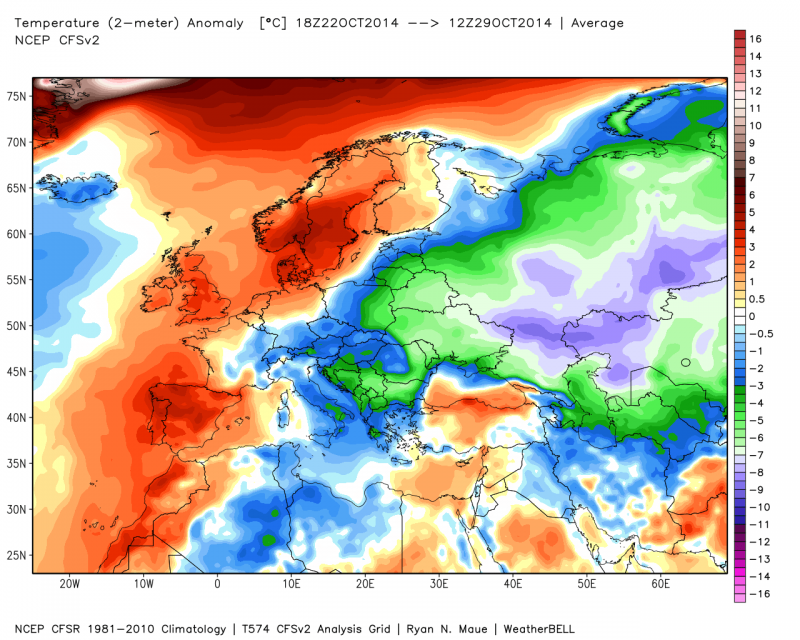 An unusually cold for mid autumn over E- CNTRL Europe during the last 7 days as a result of deep troughs/lows over E Altantic and persisting ridge over central Europe where a large upper low was maintaining over the southern Balkans. Airmass was straight from Siberia and here is a result, 4-8°C below normal temps across E Europe and Balkans while Iberia, UK and Scandinavia were 2-4°C warmer than average.