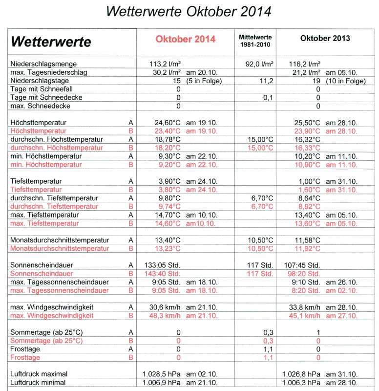 Der Oktober 2014 wird in Schwörstadt als wärmster Oktober seit 1966 in den Annalen stehen. Laut Deutschem Wetterdienst war es bundesweit der drittwärmste Oktober seit Messbeginn 1881. Der 2. Herbstmonat war gegenüber der Norm von 1981 bis 2010 mit einer Durchschnittstemperatur von 10,4°C 2,9°C zu warm und brachte einen Sonnenscheinüberschuss von 26:40 Stunden. Bei einem rekordwarmen Monat geht man automatisch von wenig Niederschlag aus: doch weit gefehlt, mit 113,2 l/m²war es sogar 21,2 l/m² zu nass.