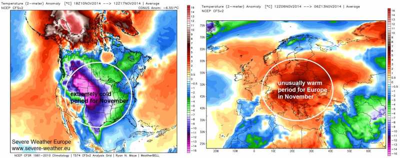 *WOW* now this is extreme!! Here is the last 7-days period temperature anomaly comparison map between USA and Europe. Notice the unusually warm period in Europe (which actually continues from late summer) compared to USA and south Canada where last week's average temp was 12-16°C colder than average!!