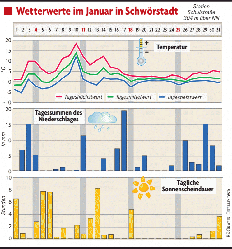 Im neuen Jahr erhalten die Tiefs wieder männliche und die Hochs wieder weibliche Namen. Mit dem aus dem letzten Jahr stammenden Hoch „Vincent“ begann das neue Jahr winterlich kalt und recht sonnig. Nach gefrierendem Regen bei –2,5°C am 2. Januar brachte Schnellläufer-Tief „Alexander“ Tags darauf mit steigenden Temperaturen windiges Regenwetter. Innerhalb nur 3 Stunden stieg am Abend die Temperatur von 2,2°C auf 9,2°C an und erreichte kurz vor Mitternacht warme 9,8°C. Am 5. Januar übernahm dann das Hoch „Antonia“, selbstredend startet auch das erste Hoch des Jahres mit A, die Regie für unser Wetter und nach sternenklaren, frostigen Nächten schien tagsüber die Sonne ungehindert vom Himmel. Nach der ersten Januarwoche, in der wir schon 46% der langjährigen gesamten Januar-Sonnenscheindauer genießen konnten, gaben sich die Sturmtiefs „Bob", „Christian“, „Daniel“, „Elon“ und „Felix“ im 12-Stundentakt mit immer milderem und zunehmend windigem Schauerwetter die Klinke in die Hand. Am 10. Januar hatten wir mit 13,6°C die zweitwärmste Nachttemperatur und mit 17,3°C die höchste Januartemperatur seit Messbeginn 1997. Nach dem Durchzug von „Felix“ sank am frühen Morgen des 11. Januar die Temperatur innerhalb 3,5 Stunden um 10°C und mit Graupel- und Schneeregenschauern fiel 11.2 l/m² Tagesniederschlag. Nachdem wir am 12. und 13. sehr freundliches und trockenes Frühlingswetter genießen konnten, am 13. schien die Sonne schon wieder 8:05 Stunden lang, brachte Tief „Gunter“ am 14. wieder das wechselhafte, windige und für die Jahreszeit zu milde Schauerwetter zurück. Die erste Januarhalbzeit endete somit 2,8°C zu warm, mit 43,2 l/m² verzeichneten wir 51% des normalen Januarniederschlages und die Sonne schien an 42:30 Stunden schon 77% der langjährigen gesamten Januar-Sonnenscheindauer. Mit Beginn der 2. Januarhälfte ging die milde Westwetterlage mit den „windigen Zeiten“ dem Ende entgegen. Die Tiefs „Hermann“ und „Iustus“ brachten uns die folgenden Tage kälteres, wechselhaftes und sehr sonnenscheinarmes Wetter mit einzelnen leichten Nachtfrösten. Im Flachland erhielten wir mit Regen, der einen oder anderen Schneeflocke und positiven Tagestemperaturen um 2-3°C jedoch nur ein „Pseudowinterwetter". Als Schneetief „Kurt“ am Abend des 24. Januars bei uns eintraf, hatte er sein Pulver(Schnee) schon verschossen, uns blieb lediglich eine „Überzuckerung“ von 1 cm, die Tags darauf schon wieder wegtaute. Der Schneefall von Tief „Leonhard“ bescherte uns dann am 26. eine 8 cm hohe Schneedecke. Nach 8 sonnenscheinlosen Tagen zeigte sich die gelbe Kugel am 27. wenigstens 20 Minuten lang, bei positiven Temperaturen um 3°C ging es der Schneedecke jedoch wieder an den Kragen. Am 30. Januar um 1 Uhr bescherte uns Sturmtief „Mischka“ mit 976,9 hPa. den tiefsten Luftdruck seit meinem Aufzeichnungsbeginn 1997, ein kurzer heftiger Schneesturm um 4 Uhr brachte innerhalb nur 20 Minuten einen Temperatursturz um 3°C und eine leicht überzuckerte Landschaft. Bis zum Monatsende blieb es dann bei einem leicht winterlichen, wechselhaften Aprilwetter.