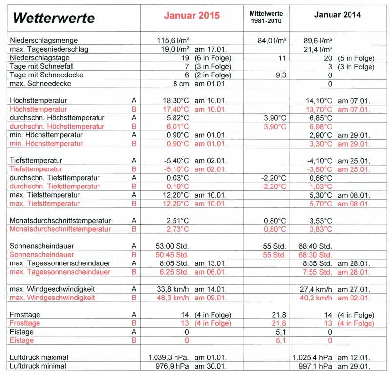 nachdem 2014 das wärmste Jahr seit Beginn der systematischen Aufzeichnungen im Jahre 1864 war, startete 2015 ebenfalls deutlich zu warm. Der Januar war mit einer Durchschnittstemperatur von 2.5°C 1,7°C zu warm, 115,6 l/m² bedeuteten einen Niederschlagsüberschuss von 38% und nachdem wir in der ersten Januarhalbzeit schon 42:30 Stunden Sonnenschein genießen konnten, reichte es in der sehr trüben 2. Januarhälfte gerade noch für bescheidene 9:50 Stunden Sonnenschein, somit erreichten wir nur 96% der normalen Januar-Sonnenscheindauer.