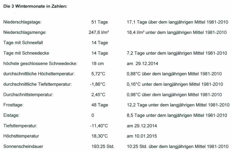 Nach dem Totalausfall des letzten Winters zeigte sich der Winter 2014/2015 trotz eines zu kalten Februars „zahnlos“ mild. Mit einer Durchschnittstemperatur von 2,45°C war der meteorologische Winter im Vergleich zur Normwertperiode von 1991 bis 2010 1°C zu warm. 247,6 l/m² an 51 Niederschlagstagen (Norm 33,9 Tage), davon 14 Tage mit Schneefall und 14 Tage mit einer Schneedecke brachten ein Niederschlagsdefizit von 18,4 l/m² und mit einer Winter-Sonnenscheindauer von 193:25 Stunden verzeichneten wir einen Sonnenscheinüberschuss von 10:25 Stunden.