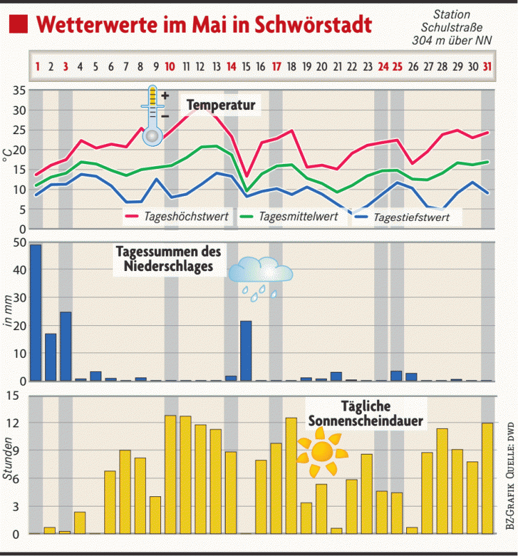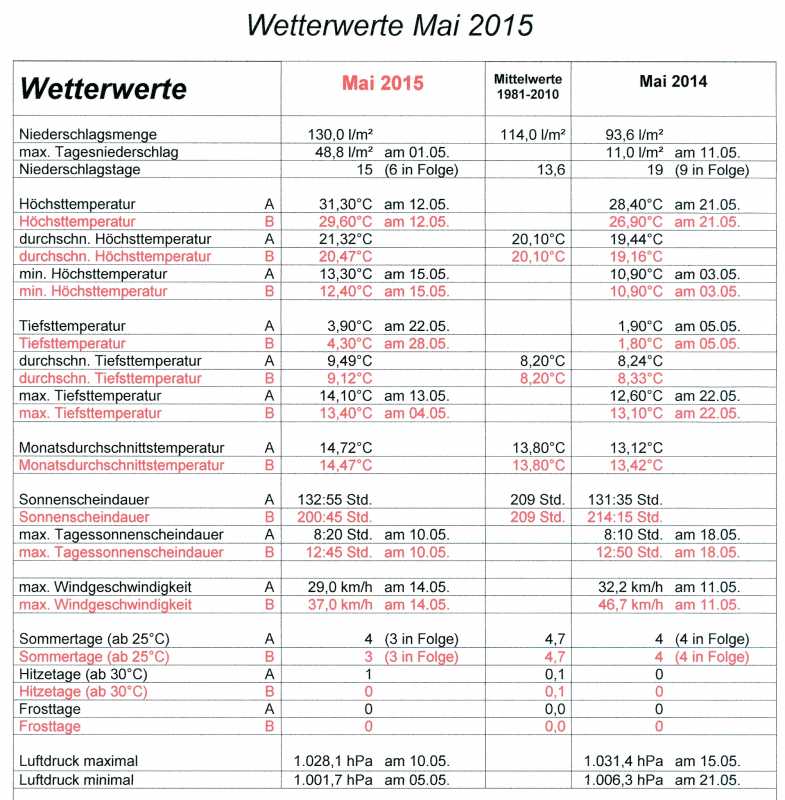 "Mai kühl und nass, füllt dem Bauern Scheun und Fass“, oder "Mairegen bringt Segen". Stimmt diese Bauernregel, dürften die Landwirte in diesem Jahr mit ihrer Ernte zufrieden sein. Nach längeren kühlen Phasen war der letzte Frühlingsmonat bedingt durch die hohen Temperaturen am Ende der erste Maihalbzeit 0,9°C zu warm und im Gegensatz zu den vorherigen Frühlingsmonaten 16 l/m² zu nass und die Sonne schien 8:15 Stunden zu kurz.