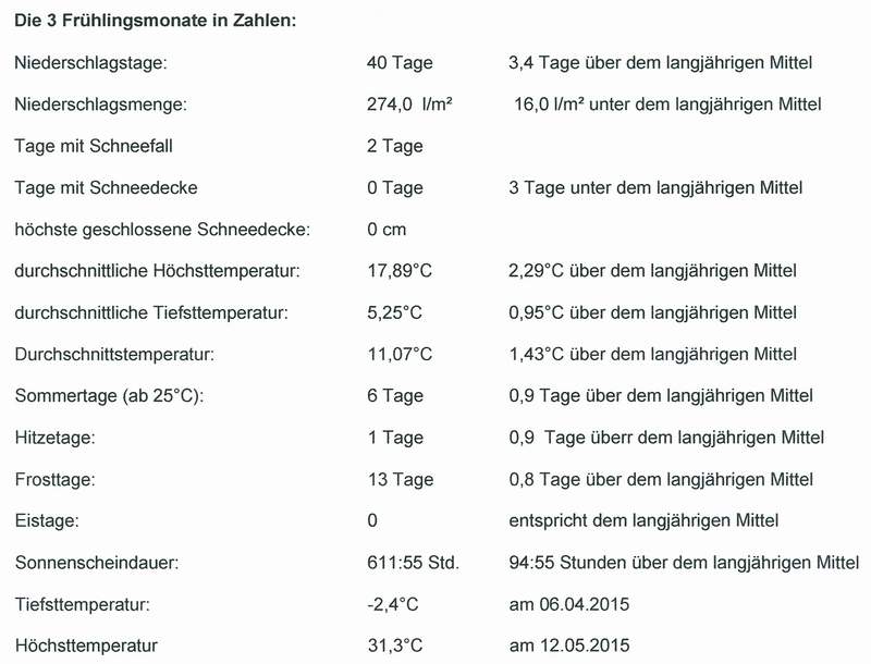 "Ist der Mai recht heiß und trocken, kriegt der Bauer kleine Brocken; ist er aber feucht und kühl, gibt es Frucht und Futter viel." Stimmt diese Bauernregel, erwartet die Bauern ein ertragsreiches Jahr. Nach längeren kühlen Phasen war der letzte Frühlingsmonat bedingt durch die hohen Temperaturen am Ende der erste Maihalbzeit doch noch 0,9°C zu warm und im Gegensatz zu den vorherigen Frühlingsmonaten 16 l/m² zu nass und 8:15 Stunden zu sonnenscheinarm. Mit 31,3°C verzeichneten wir am 12. Mai den ersten Hitzetag (ab 30°C) des Jahres.