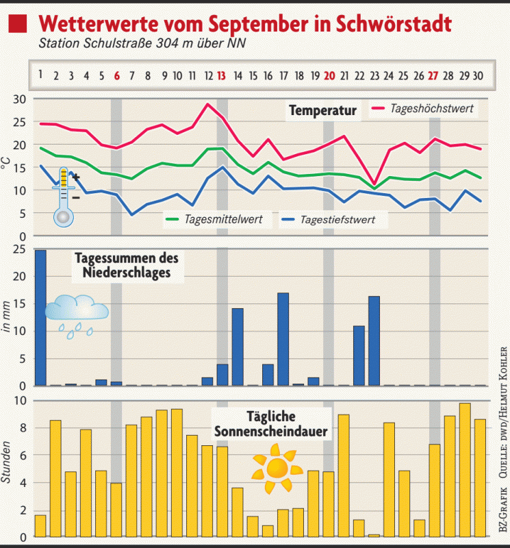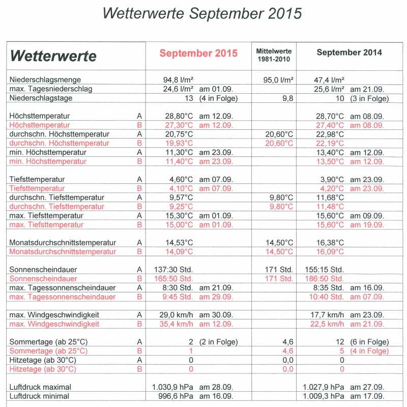 Nach 7 zu warmen und 6 zu trockenen und zu sonnigen Monaten in diesem Jahr entsprach der September mit einer Durchschnittstemperatur von14,5°C, einer Niederschlagsmenge von 94,8 l/m² und mit 165:50 Stunden Sonnenschein wieder einmal dem langjährigen Mittel der Normwertperioden von 1981 bis 2010.