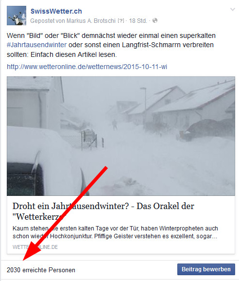 Berichte auf unserem kleinen facebook-Portälchen "SwissWetter.ch" erreichen meist zwischen 80 und 250 Leute. Gestern veröffentlichte ich einen Link zu einem Onlineportal, welcher reisserisch tönt - aber eigentlich genau das Gegenteil beinhaltet. Und siehe da: Innert 18 Stunden erreichte der Beitrag 2030 Menschen. KRASS !!! Nur weil "droht ein ‪#‎Jahrtausendwinter‬" im Titel steht.