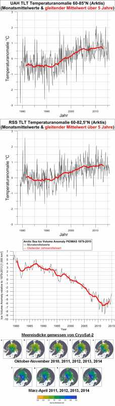 Gemäß dem Klimamodellen soll sich die Arktis infolge der globalen Erderwärmung besonders stark erwärmen. Ich habe mir gerade mal die aktuellen Temperaturdaten und Meereisdaten der Arktis besorgt und stelle zu meiner Überraschung fest, die Temperatur in der Arktis steigt nicht rapide an, sondern stagniert, bzw. sinkt in den letzten Jahren. Das zeigen Satellitendaten der Institute UAH und RSS für die Arktis (Bereich 60-82,5/85°N). (Den Bereich, welchen Bodenstationen und Seemessungen kaum abdecken und erfassen). Das Meereisvolumen nimmt seit 2011 gemäß PIOMAS (Pan-Arctic Ice-Ocean Modeling and Assimilation System) wieder zu. Und auch die Meereisdicke, sowohl im Herbst und Frühjahr nimmt gemäß den Messungen von CryoSat-2 seit 2011 leicht zu und nicht weiter ab. (Es ist wieder mehr dickes, mehrjähriges Eis (blau) vor Grönland zu sehen).