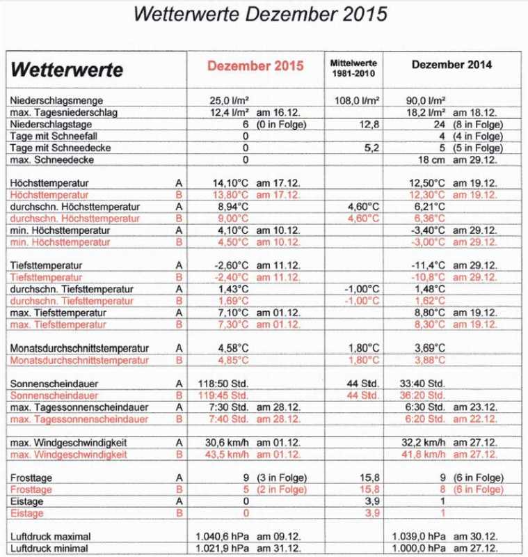 Nachdem der erste meteorologische Wintertag durch Sturmtief „Oskar“ mit 1,4 l/m² Regen recht windig und mild verlief, ging es mit Hoch „Nena“ mit ruhigem und für die Jahreszeit zu warmem Hochdruckwetter weiter. Tief „Rudi“ brachte uns am 4. vorübergehend mehr Wolken und 0,6 l/m² Regen. Hoch „Yvonne“ bescherte uns ab dem 5. wieder eine unwinterliche, ruhige Wetterlage. Wie so oft bei winterlichem Hochdruck lösten sich der Nebel und Hochnebel nur sehr zäh auf, so bekamen wir am 5. die Sonne den ganzen Tag über nicht zu Gesicht. Wegen einer fehlenden Schneedecke musste der Nikolaus auch dieses Jahr am Nikolaustag Rollen unter seinen Schlitten montieren. In den letzten 20 Jahren konnte er nur 1998 mit einer 17cm und 2010 mit einer18 cm Schneedecke auf die Rollen verzichten. Abgesehen von den 5 l/m² Regen, die uns Tief „Uwe“ am 9. Dezember brachte, blieb es mit Hoch „Zita“ mit viel Sonnenschein bis zur Monatsmitte bei dem niederschlagsfreien und für die Jahreszeit zu milden Wetter. Bereits am 13. Dezember wurde die langjährige gesamte Dezembersonnenscheindauer übertroffen. Somit war die 1. Dezemberhalbzeit 2,1°C zu warm, mit 7 l/m² fielen erst 6,5% des normalen Dezemberniederschlages und mit 51 Sonnenscheinstunden erreichten wir schon 115% des normalen Sonnenscheins in einem durchschnittlichen Dezember. Nachdem die 2. Dezemberhälfte durch Ausläufer von Tief „Yorrik“ am 16. mit 12,4 l/m² begann, bekamen wir am 17. mit Hoch „Brigitte“ wieder freundliches und für die Jahreszeit viel zu mildes Wetter. Bis auf 2,8 l/m² Regen am 21. blieb es bis über die grünen Weihnachtstage hinaus bei dem frühlingshaft anmutenden hochdruckbestimmten Wetter. In Folge dieses Frühlingswetters gab es an Heiligabend frische, vollreife Erdbeeren und Rosenstöcke und Schneeglöckchen blühten um die Wette. Mit 13,4°C verzeichneten wir am 25. Dezember die höchste Weihnachtstemperatur seit 1997. Auch nach den Weihnachtstagen blieb Hoch „Brigitte“ mit Unterstützung von Hoch „Christine“ bei uns bis Silvester wetterbestimmend. Nach wochenlangem Hochdruckeinfluss mit zuletzt 9 niederschlagsfreien Tagen in Folge stellte sich die Wetterlage zum Abschluss des Jahres um. Atlantische Tiefausläufer brachten uns am Silvestertag trübes Wetter und 3 l/m² Regen.
