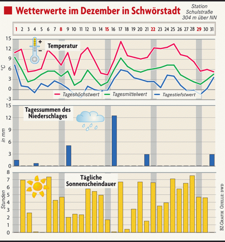 In Sachen Winter war der Dezember als erster Wintermonat ein Totalausfall und das obwohl die Königskerze eines bayerischen Hobbygärtners doch einen Jahrhundertwinter prophezeite. Hauptsächlich Dank Hoch „Brigitte“ hatten wir in Schwörstadt mit einer Durchschnittstemperatur von 4,6°C (Norm 1,8°C) und mit 120 Sonnenscheinstunden (Norm 44 Std.) den wärmsten und sonnigsten Dezember der letzten 50 Jahre. Laut Meteo Schweiz ist es in unserer Region der wärmste und sonnigste Dezember seit über 150 Jahren. Mit 25 l/m² Niederschlag erreichte der Dezember nur 23 % seines Solls von 108 l/m².