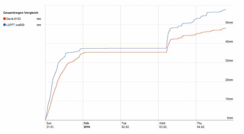 Meine 2. Station 1,5 km westlich hatte einen Januar-Niederschlag von 171,2 l/m² (DAVIS). Diese Station liegt total frei und der Wind bläst ungehindert darüber. Bei starkem Wind zeichnet diese Station deutlich weniger Niederschlag auf.