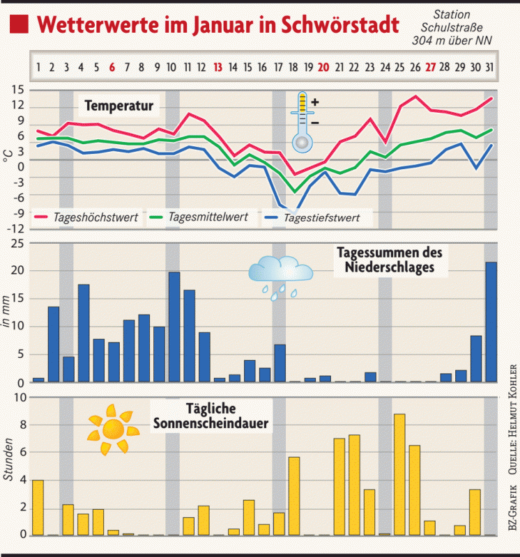 Die Station Bad Säckingen 8 km süd-östlich kam im Januar nur auf 138,4 l/m² (DAVIS)