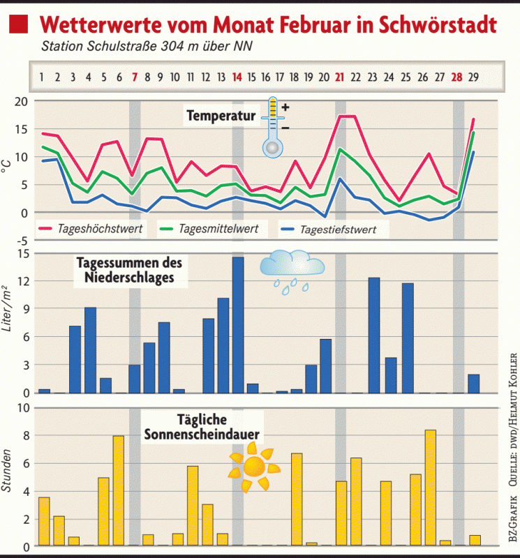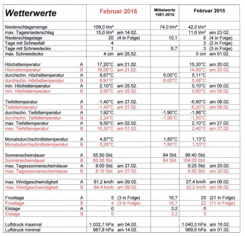 Bedingt durch das Zusammenspiel zwischen tiefem Luftdruck von Neufundland bis nach Skandinavien und hohem Luftdruck von den Azoren bis zum Schwarzen Meer befanden wir uns zum Start in den letzten Wintermonat andauernd in einer kräftigen westlichen Strömung. Mit dem Durchzug der Tiefs „Marita“, „Norkys“, „Pia“ und „Quirina“ wurde in den ersten Februartagen sehr milde, zum Teil sogar subtropische Luft zu uns geführt. Bei frühlingshaften Temperaturen zeigte sich die erste Februarwoche wechselhaft, regnerisch und windig. Pünktlich zum Höhepunkt der Fasnacht bestimmten neben den Narren auch die Sturmtiefs „Ruzika“ und „Susanna“ das Tagesgeschehen. Waren am Rosenmontag die Böen von „Ruzika“ mit 60–70 km/h noch gnädig, sorgte „Susanna“ am Fasnachtsdienstag für stürmische Verhältnisse. Mit dem Durchzug einer Kaltfront gab es um 18 Uhr, begleitet von Blitz und Donner schon Böen um 90 km/h. Nach einer kurzen Beruhigung brachten nach 22 Uhr Böen um 100 km/h auch nichtalkoholisierte Narren und Fußgänger ins schwanken. Bei weiterhin wechselhaftem und windigem Wetter gelangte auf der Rückseite der Kaltfront kühlere Luft in unsere Region. Dank den Tiefs „Therese“ und „Ulrika“ hatten wir bis zur Monatsmitte kühles Schmuddelwetter. Ohne jeglichen Frost war die erste Februarhalbzeit 4°C zu warm, mit 68,6 l/m² fielen bereits 93% des langjährigen Februarniederschlages und die Sonne schien an 29:45 Std. nur 35% des Februarsolls. Mit Hoch „Friedrich“ startete die 2. Februarhalbzeit hochdruckbestimmt, aber wie so oft bei winterlichen Hochdrucklagen lagen wir oft unter einem dichten Hochnebeldeckel. Ab dem 19. brachten die Tiefs „Virginie“, Walburga“ und „Xin“ mit auffrischenden Westwinden milde und feuchte Luftmassen in unsere Region und gestalteten unser Wetter erneut wechselhaft unbeständig. Als es in der Nacht auf den 20. Februar aufklarte, verzeichneten wir mit –0,8°C den ersten Frost in diesem Februar. Seit Beginn meiner Aufzeichnungen 1997 gab es noch nie 19 frostfreie erste Februartage. Mit den milden Luftmassen erreichten wir am 22. und 23. mit jeweils 17,2°C die bisher höchste Temperatur des Jahres. Nachdem uns am Abend des 24. die Kaltfront von Tief „Yuki“ erreichte, war es mit den vorfrühlingshaften Temperaturen zu Ende. Passender hätte der Tiefdruckname nicht sein können, Yuki bedeutet in der japanischen Sprache Schnee und genau diesen gab es am 25. Mit 4 cm hatten wir die erste und einzige Schneedecke in diesem Februar. Die folgenden 3 Tage des letzten meteorologischen Wintermonats brachten uns mit für die Jahreszeit angemessenen Temperaturen recht sonniges und niederschlagsfreies Wetter. Zum Monatsabschluss bekamen wir am 29., dem zusätzlichen Schaltjahrtag in Form von Nieselregen und leichtem Schneefall nochmals 2 l/m² Niederschlag.