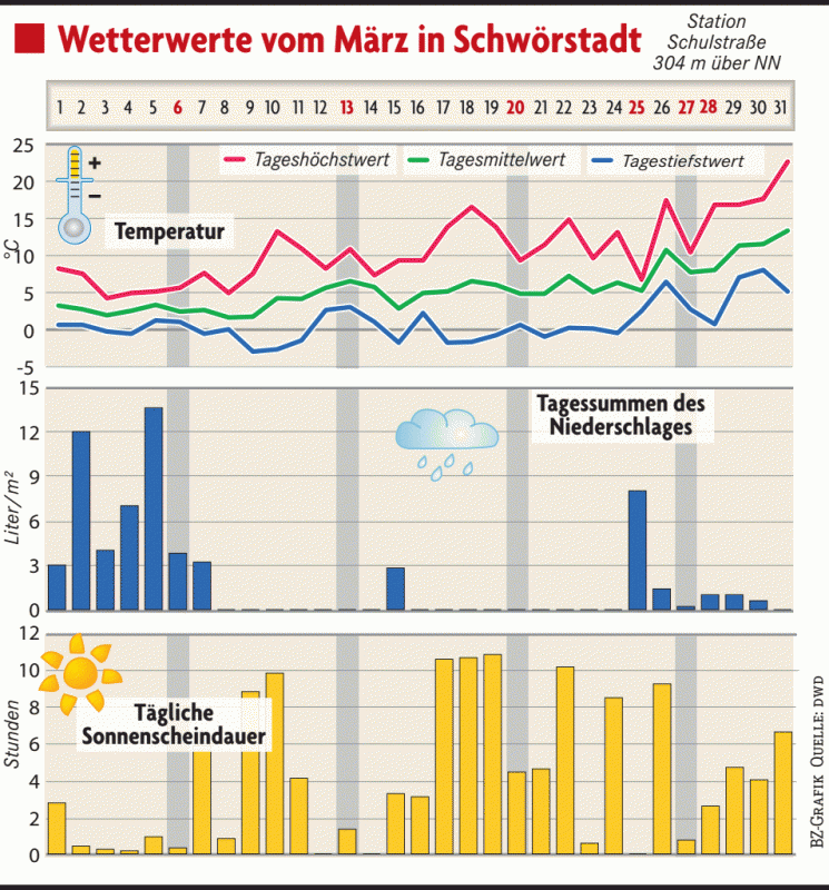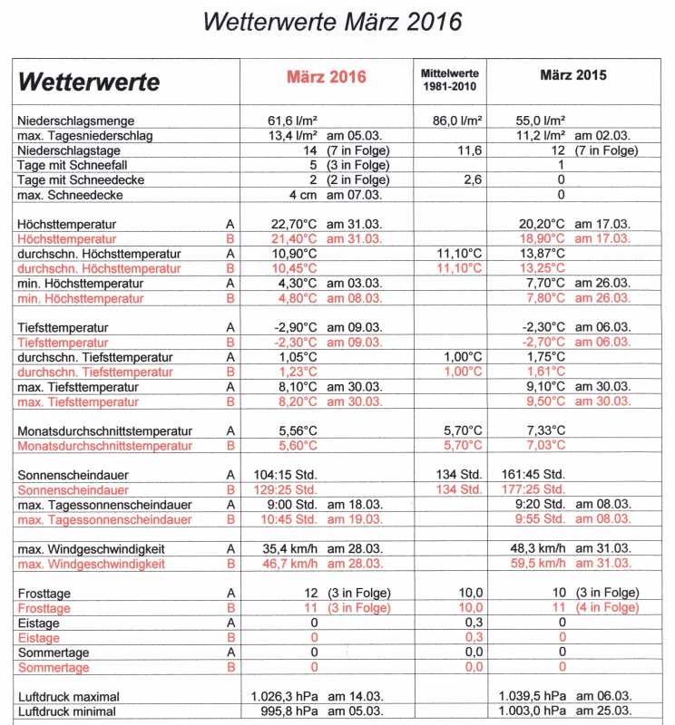 Nach 12 zu warmen Monaten in Folge war der März als erster Frühlingsmonat zu kalt. Die ersten 28 Märztage waren sogar kälter als der vergangene Februar. Nach der letzten, frühlingshaften Märzwoche hatten wir gegenüber der Norm von 1981 bis 2010 mit einer Durchschnittstemperatur von 5,6°C eine negative Temperaturabweichung von 0,1°C. Mit 61,6 l/m² fielen nur 72% des Märzsolls, wobei sich der Niederschlag nach der ersten Woche bereits auf 46,6 l/m² summierte. 129:25 Sonnenstunden reichten für 97% der normalen März-Sonnenscheindauer.