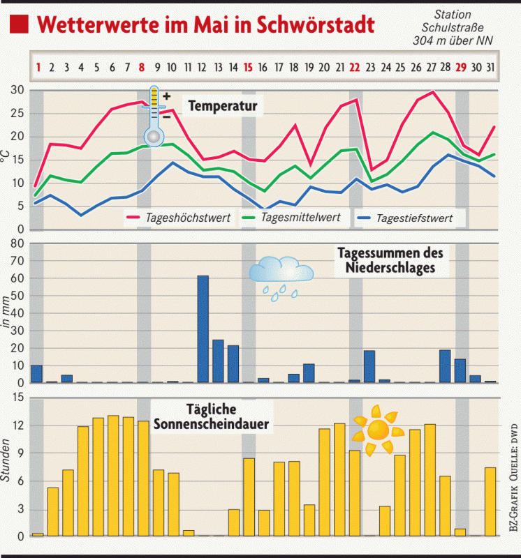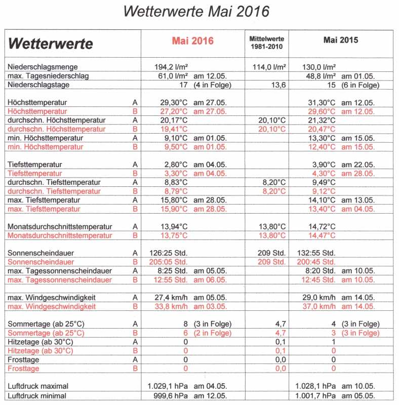 Mit Tief „Viola“ startete der „Wonnemonat Mai“ wie bereits in den 2 Vorjahren kühl und nass. Benötigten die Maibummler noch Regenschutz und Winterjacken, konnten die Vatertagswanderer Dank Hoch „Peter“ am 5. Mai schon mit T-Shirt und Sonnenbrille auf die Tour gehen. Vom Vatertagshoch „Peter“ durften jedoch außer den Vätern auch die Mütter profitieren, denn das sonnige und von Tag zu Tag wärmere Frühlingswetter bescherte uns am 8. Mai, dem Muttertag mit 27,2°C einen herrlichen Frühsommertag. Zuvor verzeichneten wir am 6. Mai mit 25,6°C den ersten Sommertag (ab 25°C) des Jahres. Nach 6 niederschlagsfreien Tagen in Folge brachte uns Tief „Xandrea“ am 10. mit immer noch sommerlichen Temperaturen 0,4 l/m² Regen. Nach einem weiteren trockenen Tag sorgte Tief „Yekatarina“ ab dem 12. Mai pünktlich zu den Eisheiligen mit ca. 10°C kälteren Temperaturen für unwetterartigen Dauerregen. Von Donnerstagmorgen 12. Mai bis Freitagmorgen 13. Mai fielen bei Dauerregen 77 l/m². Bei weiteren Regenschauern und Gewittern erhöhte sich die Niederschlagssumme bis zum 14. Mai auf 106 l/m² innerhalb 2,5 Tagen, das ist ungefähr die normale gesamte Mai-Regenmenge. Nach diesen enormen Regenmengen wurde bereits am 14. Mai der langjährige normale Mainiederschlag um 6,2 l/m² übertroffen. Nach einem eher winterlichen Pfingstfest war die erste Maihalbzeit gegenüber der Norm von 1981 bis 2010 1°C zu kalt, der normale gesamte Mainiederschlag wurde bereits um 6,6 l/m² übertroffen und die Sonne schien 48% des Maisolls. Unter dem fast täglichen Einflusswechsel der Tiefs „Zooey“, „Arlette“ und „Barbara“ und den Hochs „Quintus“ und „Reimar“ erlebten wir in den ersten 9 Tagen der 2. Maihalbzeit wettertechnisch eine Achterbahnfahrt. So hatten wir mit viel Sonnenschein am 22. Mai um 14:35 Uhr mit 27,6°C die bisher höchste Temperatur des Jahres, nur einen Tag später war es zur gleichen Zeit mit regnerischen 10,4°C 17,2°C kälter. Ab dem 26. Mai meldete sich der Sommer zurück. Mit einer südwestlichen Luftströmung wurden Tag für Tag zunehmend schwülwarme und somit gewitteranfällige Luftmassen zu uns geführt. Daraus resultierend bekamen wir typisches „Tagesgangwetter“ mit Sonne am Morgen und Quellwolken mit anschließenden Gewittern am Spätnachmittag und Abend. Mit diesen schwülwarmen Luftmassen stieg die Temperatur am 27. mit 29,3°C auf den bisher höchsten Wert des Jahres an. Nachdem im Laufe des 29. Mai die schwülwarme Luft ausgeräumt wurde, hatte auch die Gewittertätigkeit ein Ende. Unter der Regie von Tief „Elvira“ verabschiedete sich dann der Wonnemonat Mai mit wechselhaftem und kühlerem Schauerwetter.