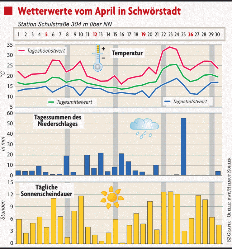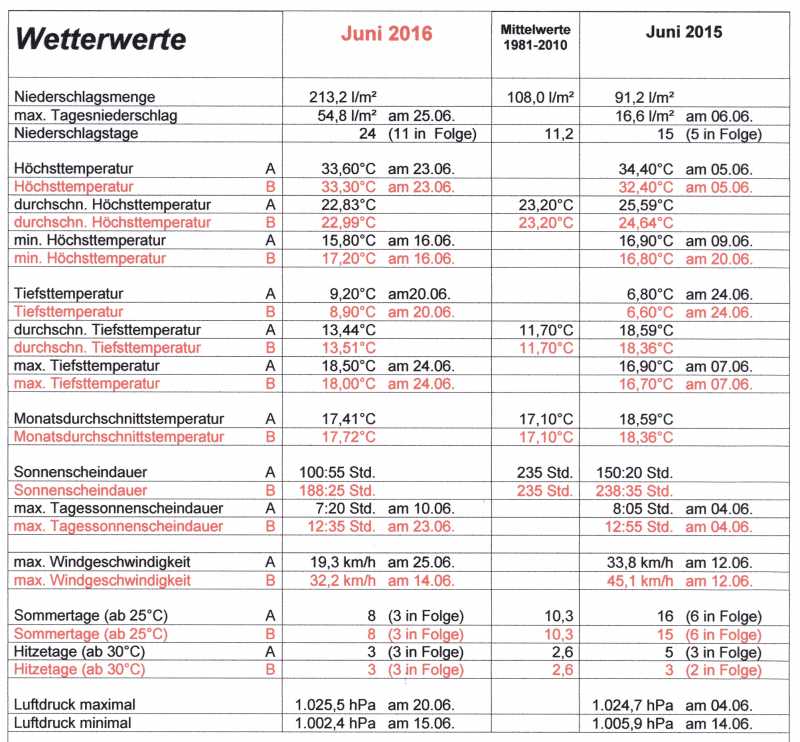 „Heuer kein Heuwetter“. Die Vermutung dass der Juni viel zu nass war entspringt nicht nur dem subjektiven Eindruck, sondern lässt sich auch mit den Messwerten bestätigen. Mit einem Niederschlagsüberschuss von 105,2 l/m² war der 0,3°C zu warme und 47 Stunden zu sonnenscheinarme erste Schwörstädter Sommermonat der niederschlagsreichste Juni seit über 50 Jahren.